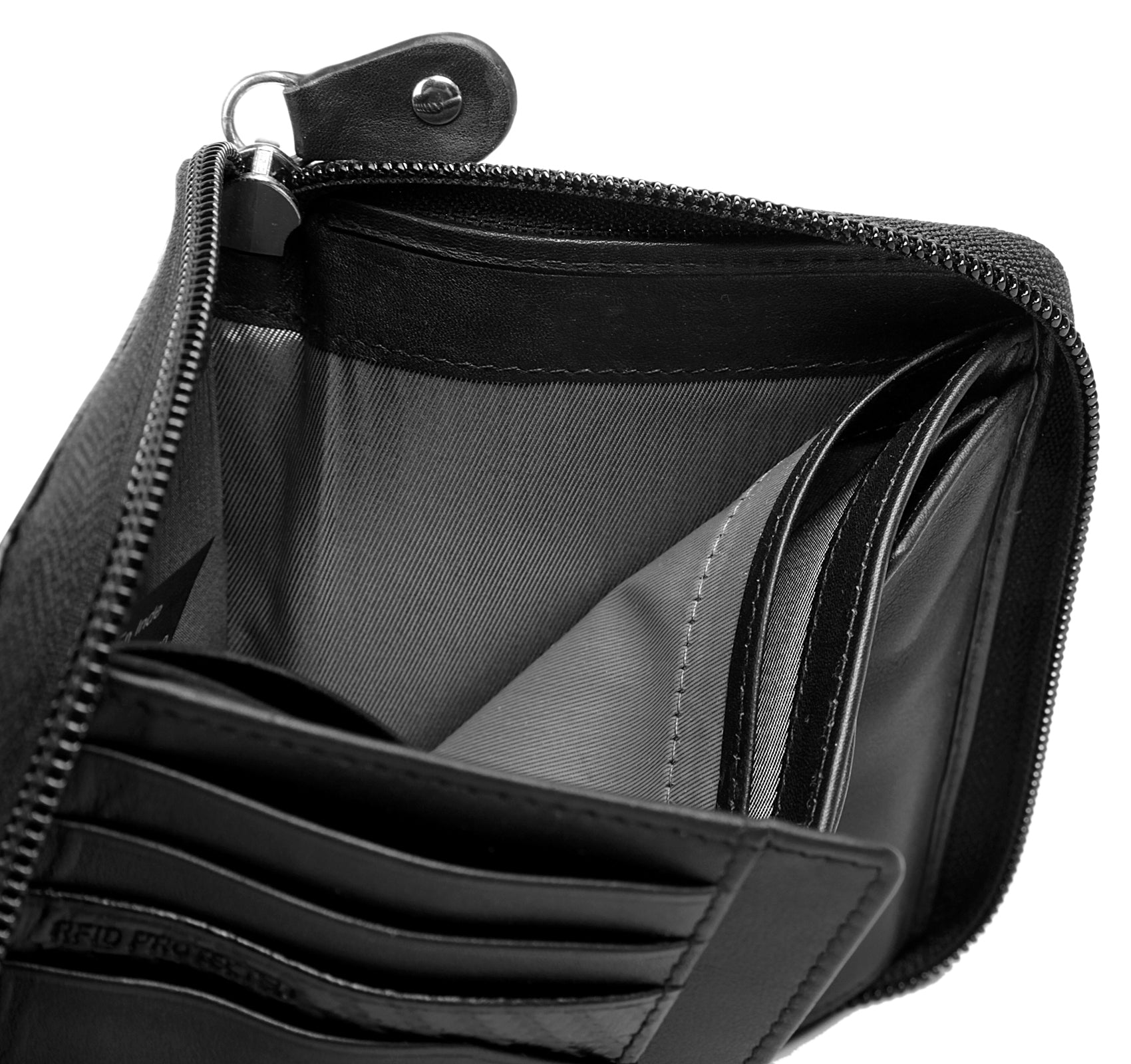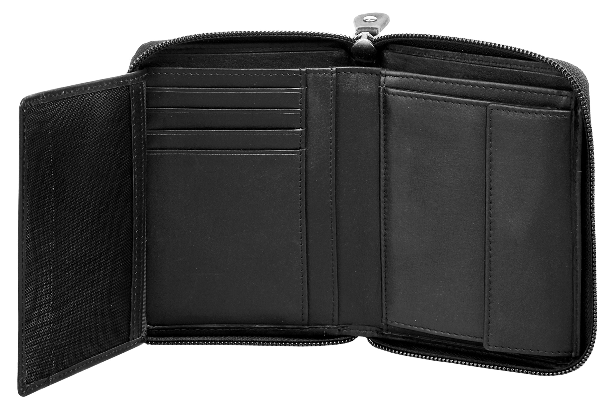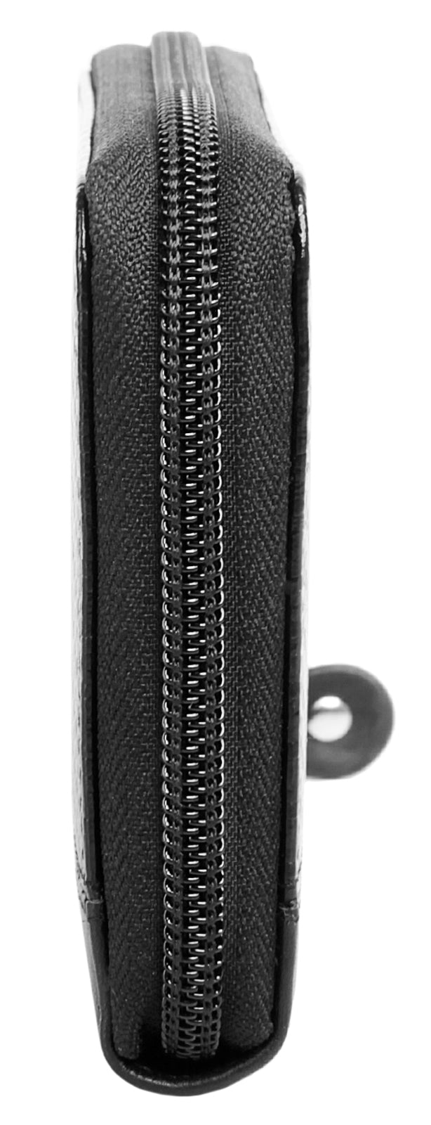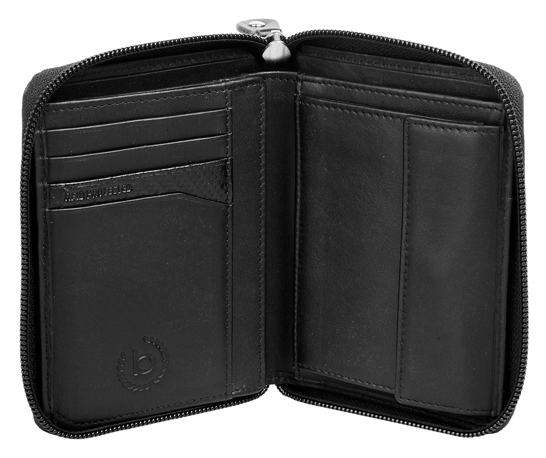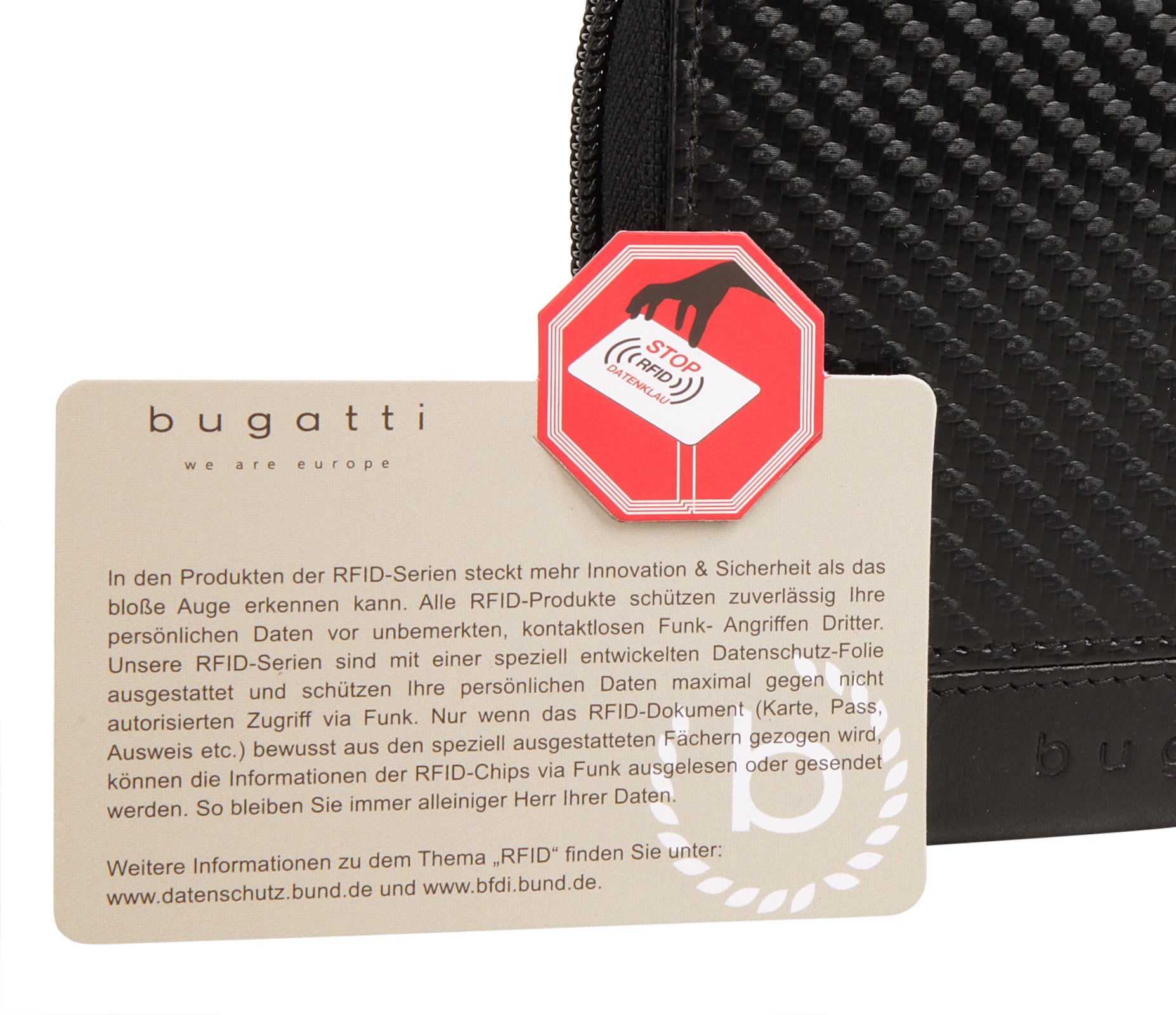 Diese Geldbörse von bugatti lässt nichts vermissen: 2 Schein-, 8 Karten- und 4 Steckfächer sowie 1 Sicht- & 1 Münzfach mit Druckknopfverschluss sind hier vereint. Ein umlaufender Reißverschluss fasst die Geldtasche kompakt & sicher. Insbesondere Bankkarten sind in dieser Leder Geldbörse sicher aufbewahrt, da der integrierte RFID-Schutz Ihre Daten vor Missbrauch und Zugriff durch Scan schützt. Komplettiert wird das klassische Design durch die minimalistische Flechtoptik und eine dezente Logoprägung.