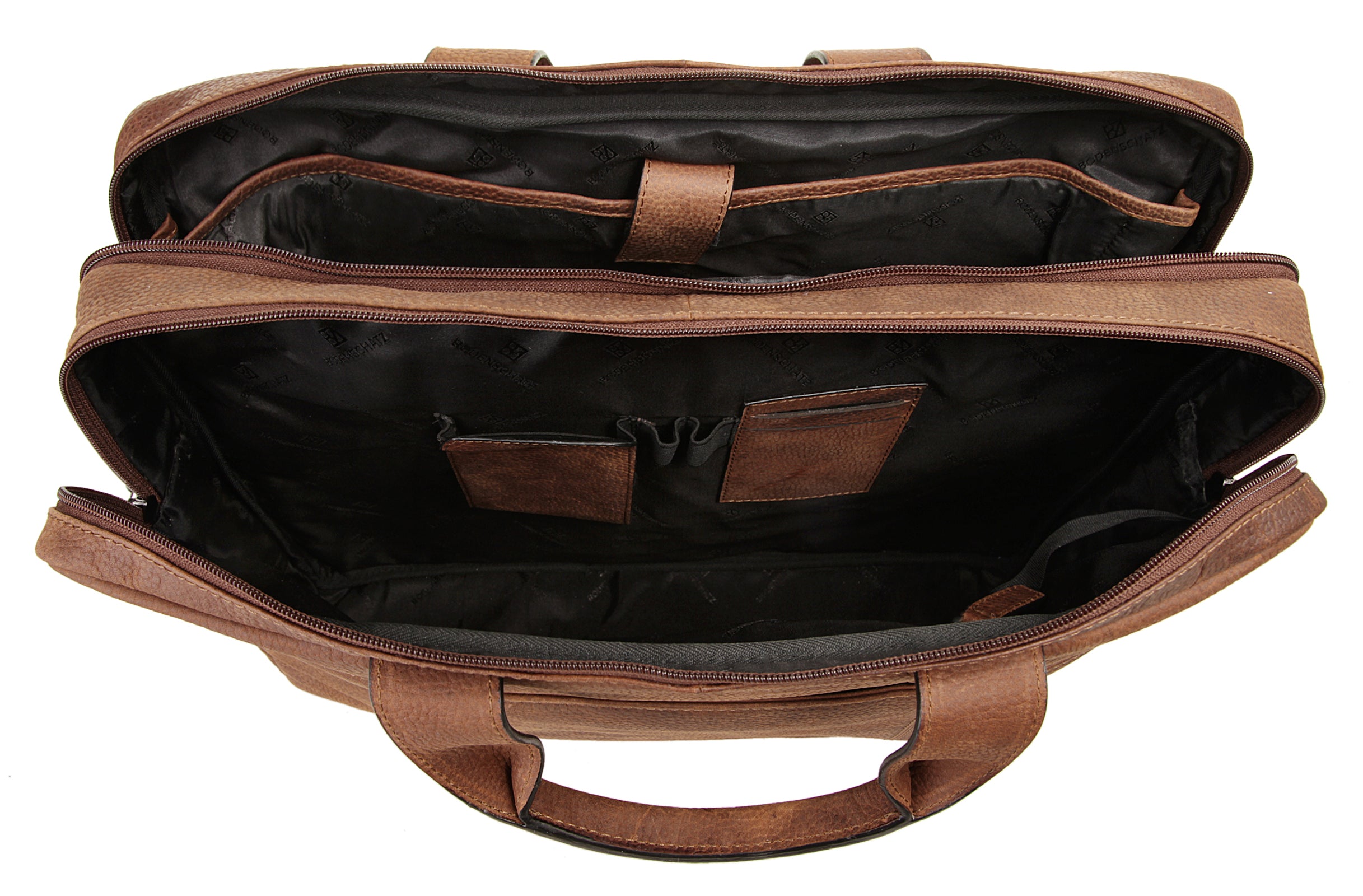 Diese Leder Aktentasche von Bodenschatz ist perfekt für Büro, Businessmeetings und Reisen! Ein gepolstertes Innenfach schützt Ihr Notebook vor leichten Stößen. Zwei großzügige Hauptfächer passen bestens für A4-Dokumente und Ordner. Die Tasche hat zwei Tragegriff, kann aber mit dem abnehmbaren Schulterriemen auch als Umhängetasche getragen werden. Ein kleiner Organizer im Inneren bewahrt Smartphone, Visitenkarten und Stifte griffbereit und übersichtlich auf. An dem zeitlosen, schlichten Design und der praktischen Innenausstattung werden Sie lange Freude haben!