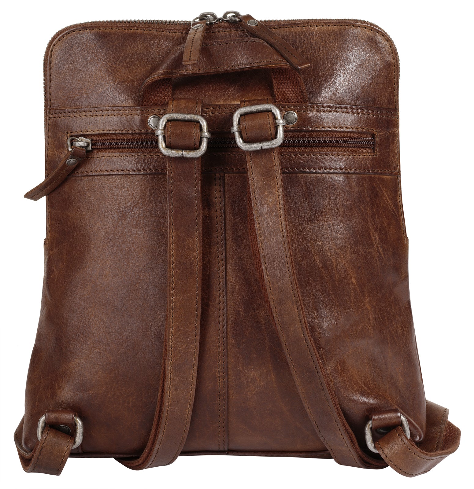 Begeben Sie sich auf eine Zeitreise mit dem Damen Leder Rucksack im Vintage Look von Spikes & Sparrow. Mit seinem nostalgischen Charme und langlebigen Leder wird er Ihr neues Lieblingsstück. Das Hauptfach bietet Platz für Smartphone, Portemonnaie sowie eine kleine Wasserflasche. Der integrierte Schlüsselanhänger vermindert das Suchen nach Schlüsseln. Eine Vordertasche mit Zierschloss ist ideal für kleine Gegenstände wie Handcreme & Taschentücher. Ob Stadtbummel oder City-Trip, dieser Rucksack ist der perfekte Begleiter für jedes Abenteuer. Die stufenlos verstellbaren Schultergurt passen sich Ihren Bedürfnissen wunderbar an.