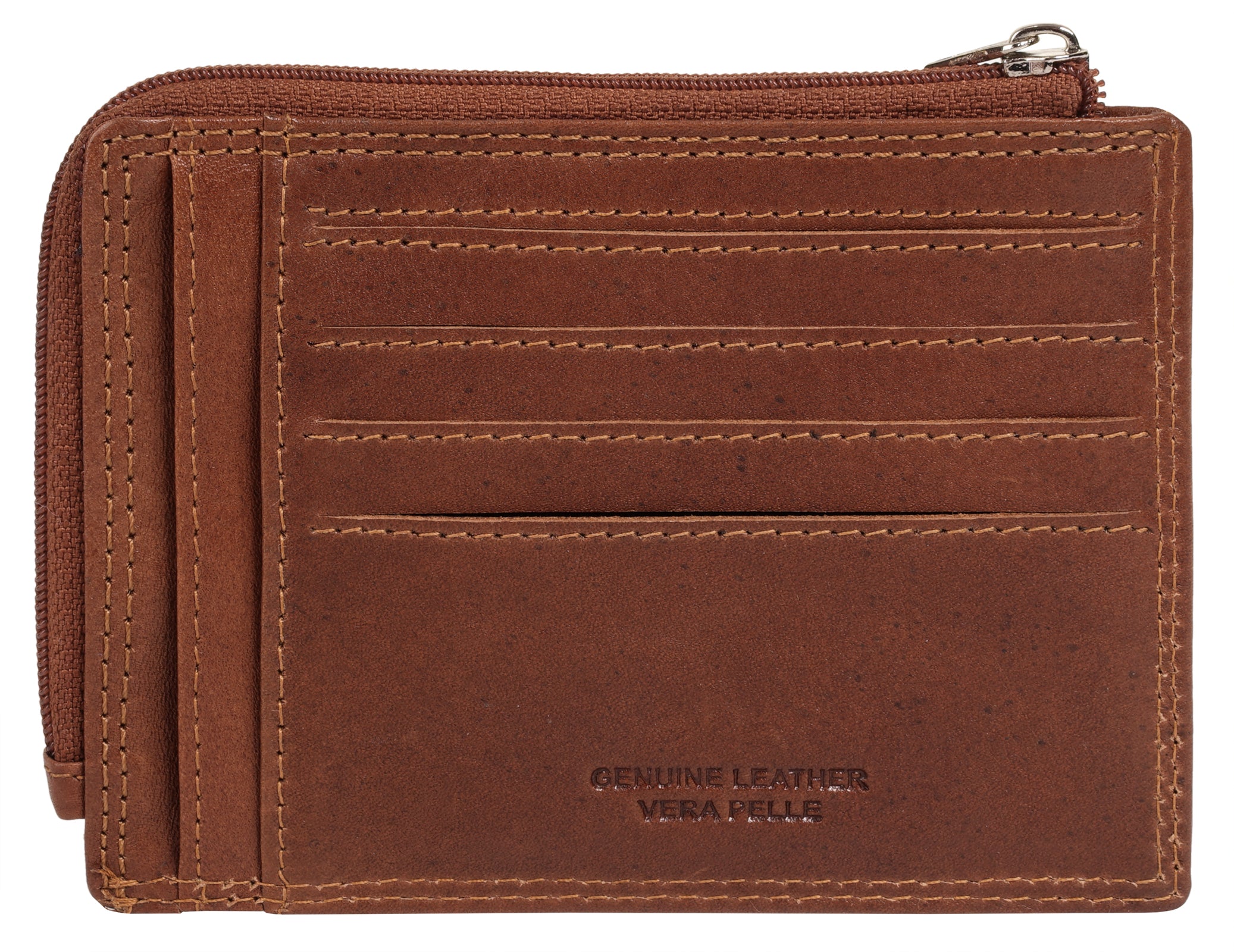 Das Wichtigste auf einen Blick mit dem Leder Kreditkartenetui im charmanten Vintage-Look von piké! Diverse Einsteckmöglichkeiten bieten Platz für ausgewählte Kartenoptionen und Ausweise, während ein Reißverschlussfach perfekt für Ihr Bargeld ist. Somit ist das Leder Kreditkartenetui ideal geeignet zu Clutches, Gürteltaschen oder kleinen Umhängetaschen. Die besonders schmale Form und das minimale Gewicht der Geldbörse lässt sie in jeder Jacken- und Hosentasche verschwinden.
