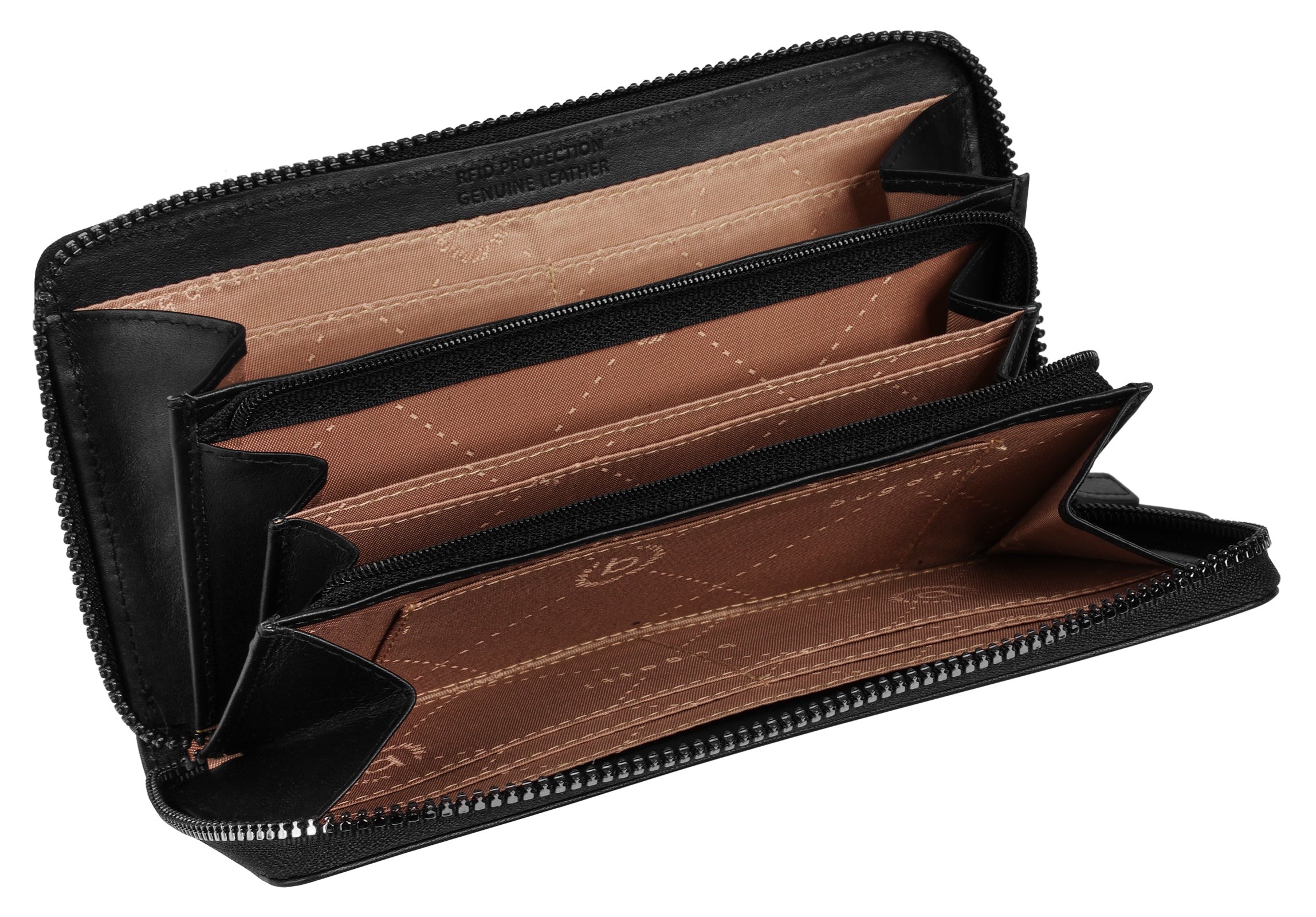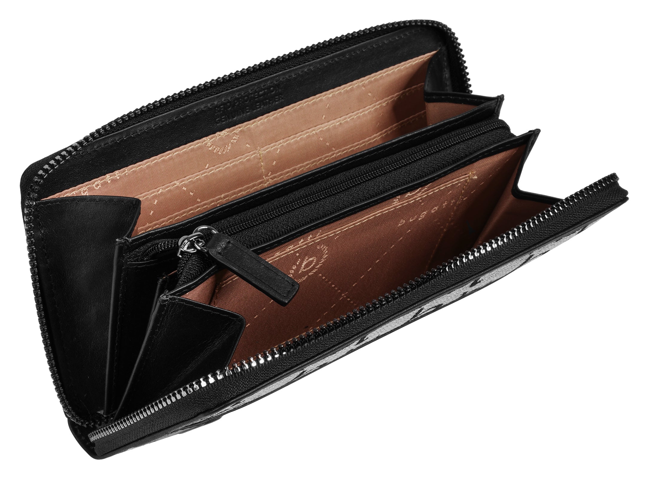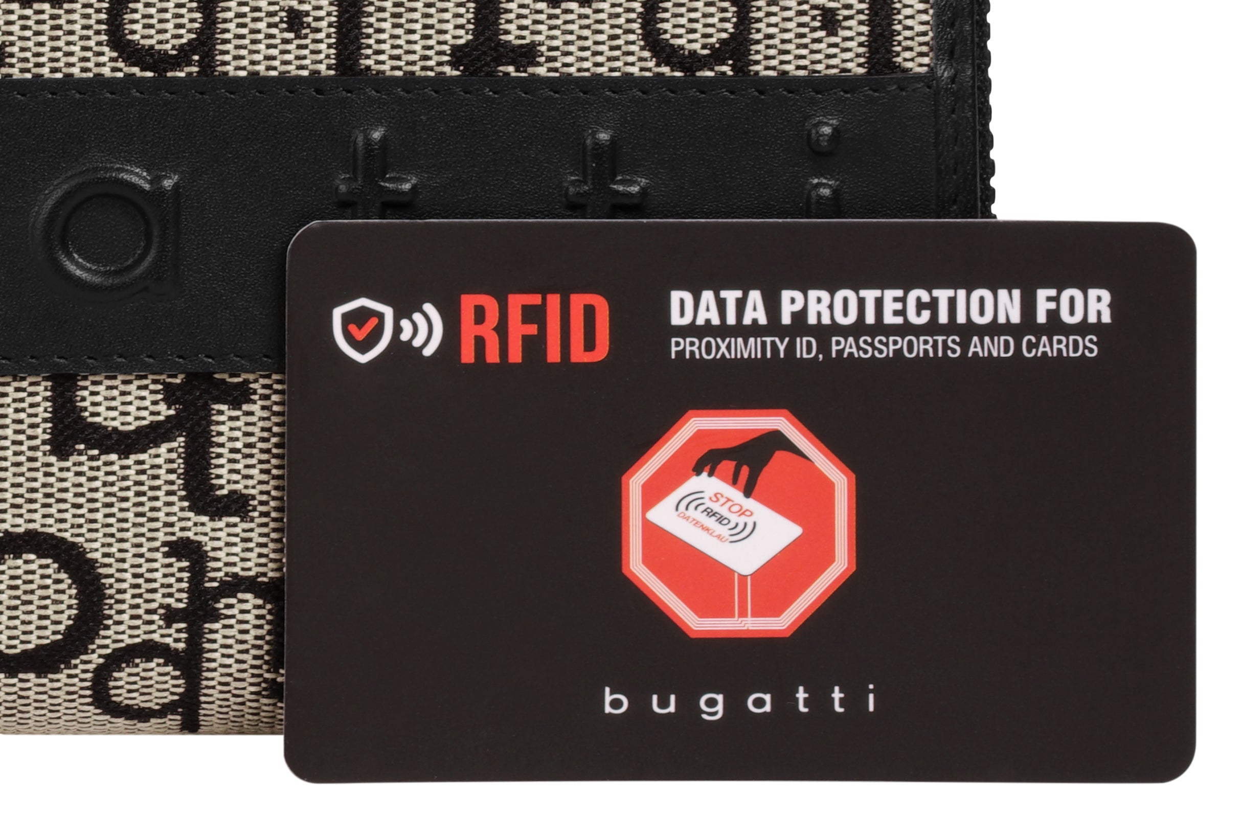 Moderner Look und durchdachtes Fächerrepertoire: die Geldbörse von bugatti. Für ein ausgefallenes Design sorgen raffinierte Monogramm-Stickereien des Markennamens an der Außenseite des Portemonnaies. Das Hauptfach überzeugt mit diversen Einsteckmöglichkeiten für Ihre Karten- und Bargeldoptionen. So verfügt die Brieftasche neben Karten-, Steck- & Geldscheinfächern über ein Münzfach innen sowie ein Reißverschlussfach an der Rückseite. Zusammen mit dem umlaufenden Reißverschluss sorgt der RFID-Schutz für noch mehr Sicherheit, indem er unautorisiertes Auslesen Ihrer privaten Kartendaten verhindert.