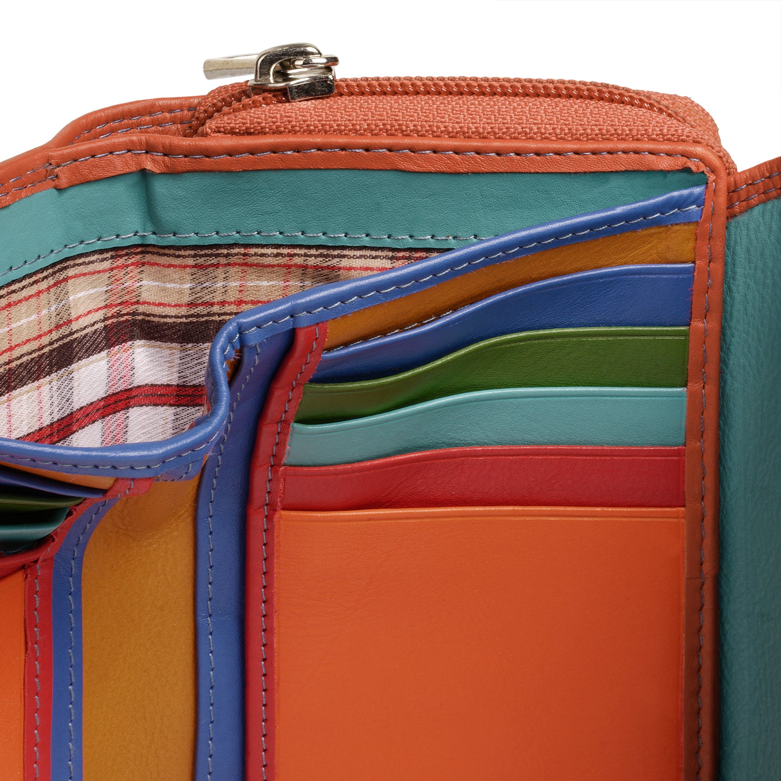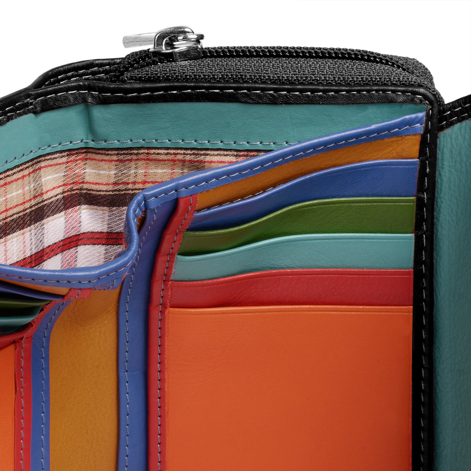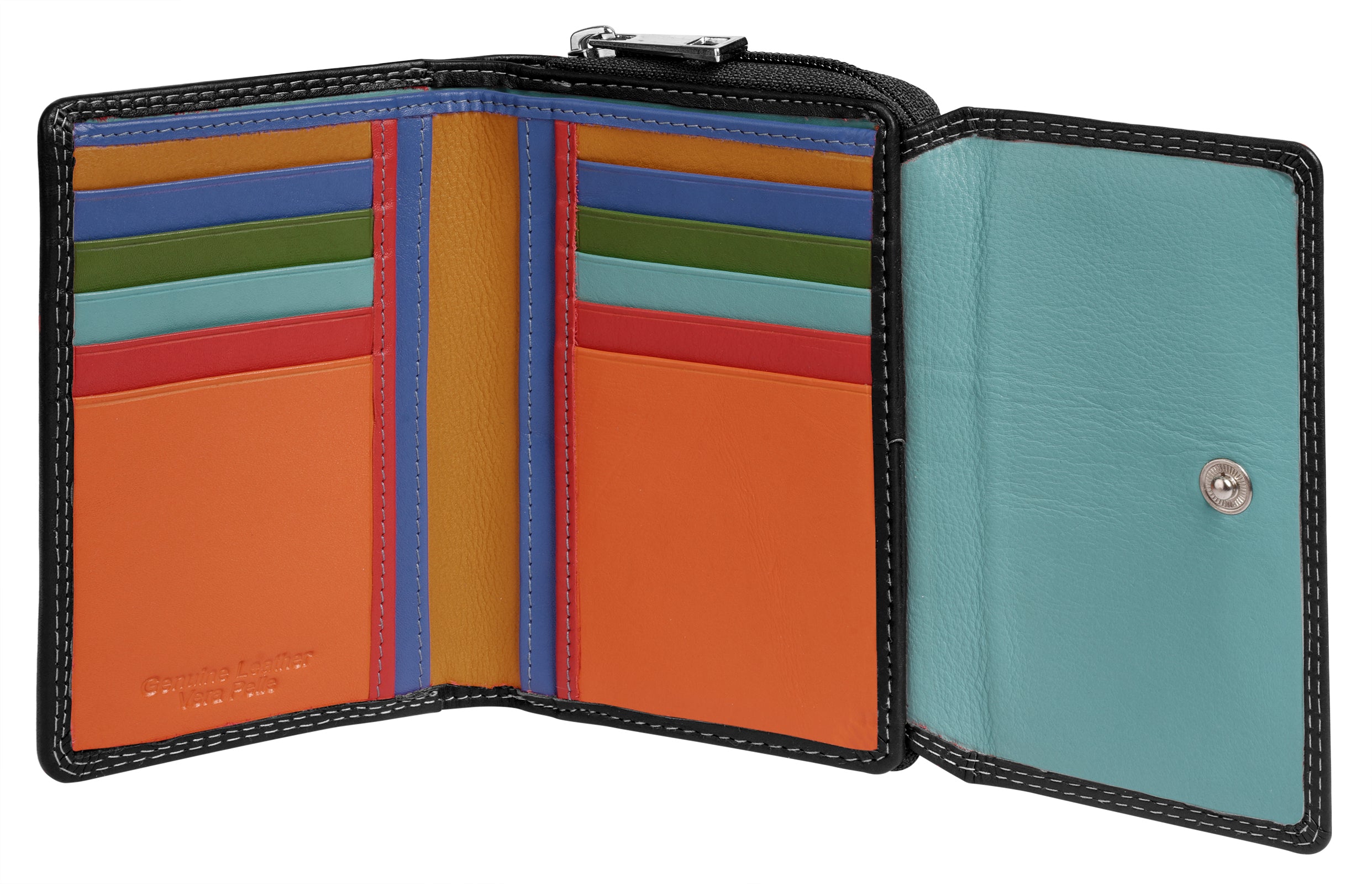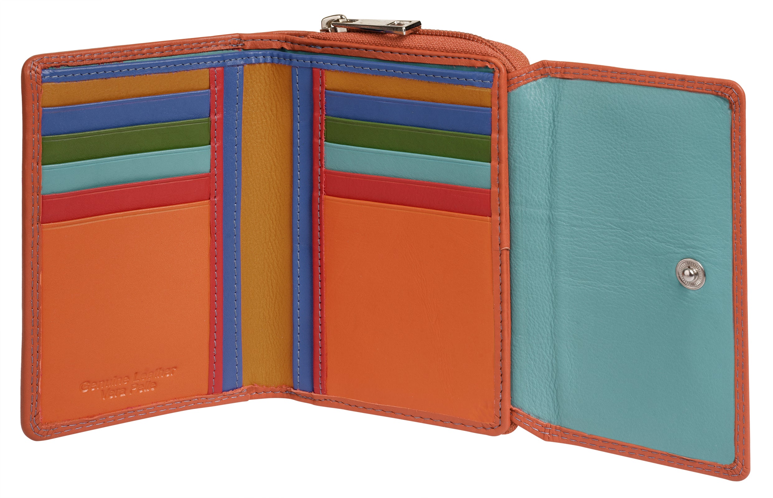 Farbenfroher Look und hochwertige Verarbeitung - das ist die Leder Geldbörse von Samantha Look. Insgesamt 10 Karten-, 4 Steck- sowie 1 Scheinfach ermöglichen Ihnen eine geschützte Verwahrung all Ihrer Karten- und Bargeldoptionen. Dank eines mittigen Reißverschlussfaches ist das Münzfach 2-geteilt. Ein umlaufender Reißverschluss sowie Druckknöpfe halten Ihr modernes Portemonnaie sicher zusammen.