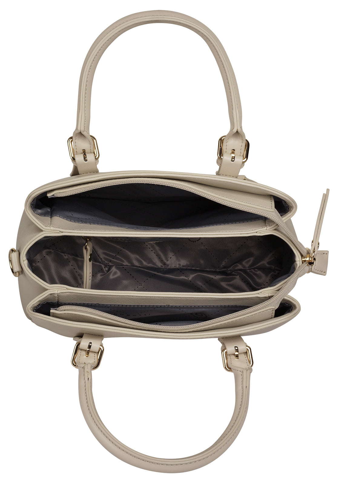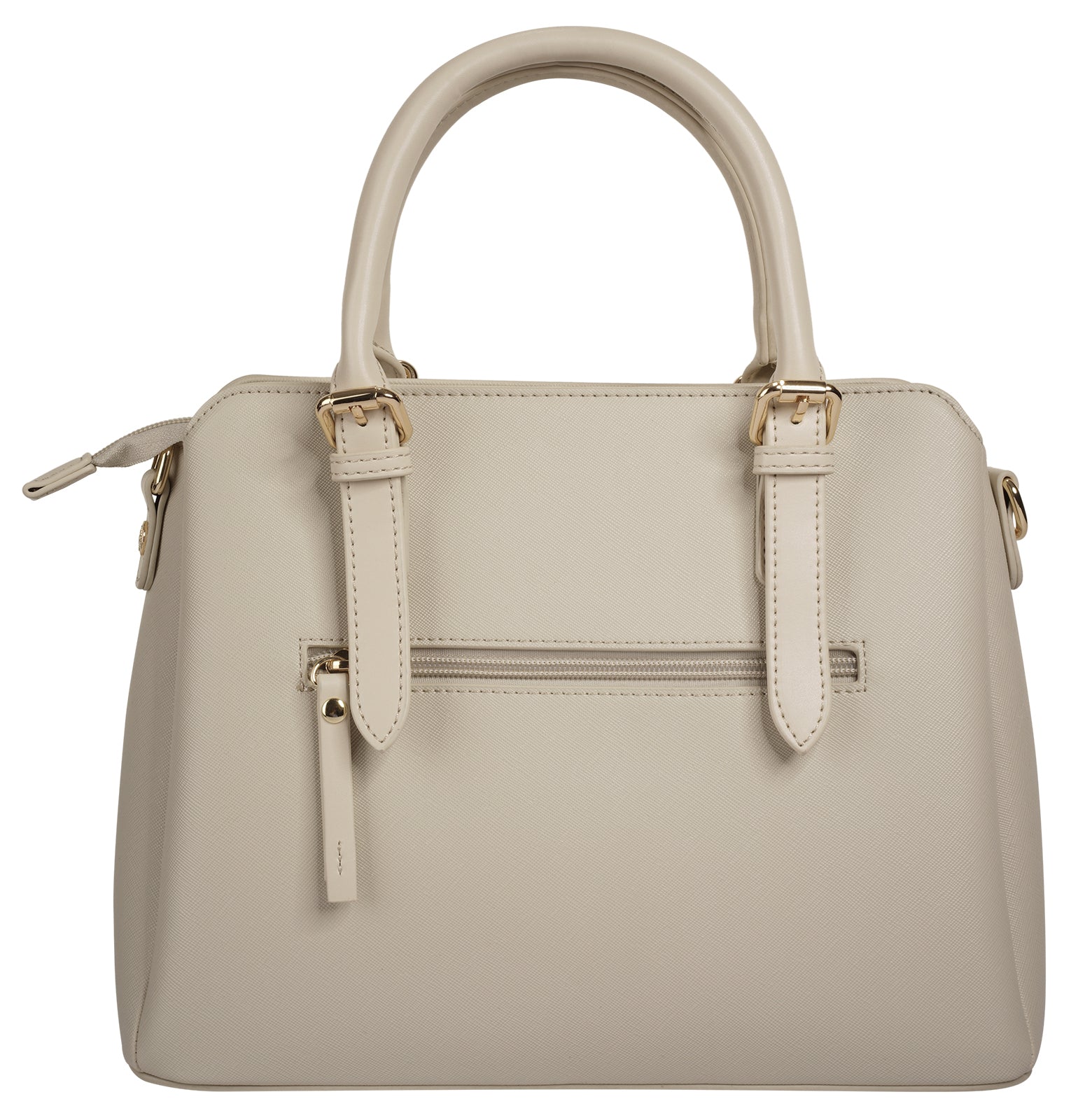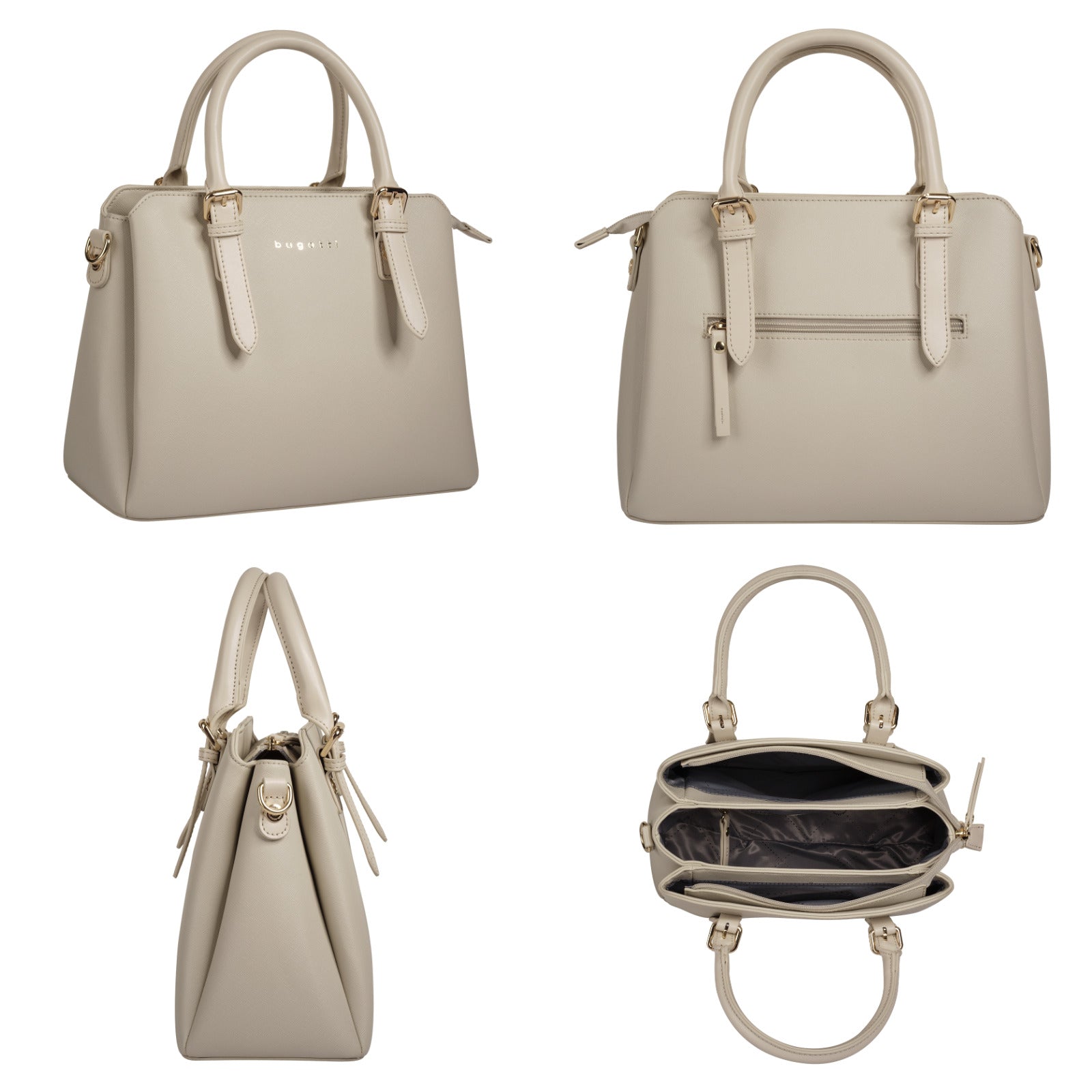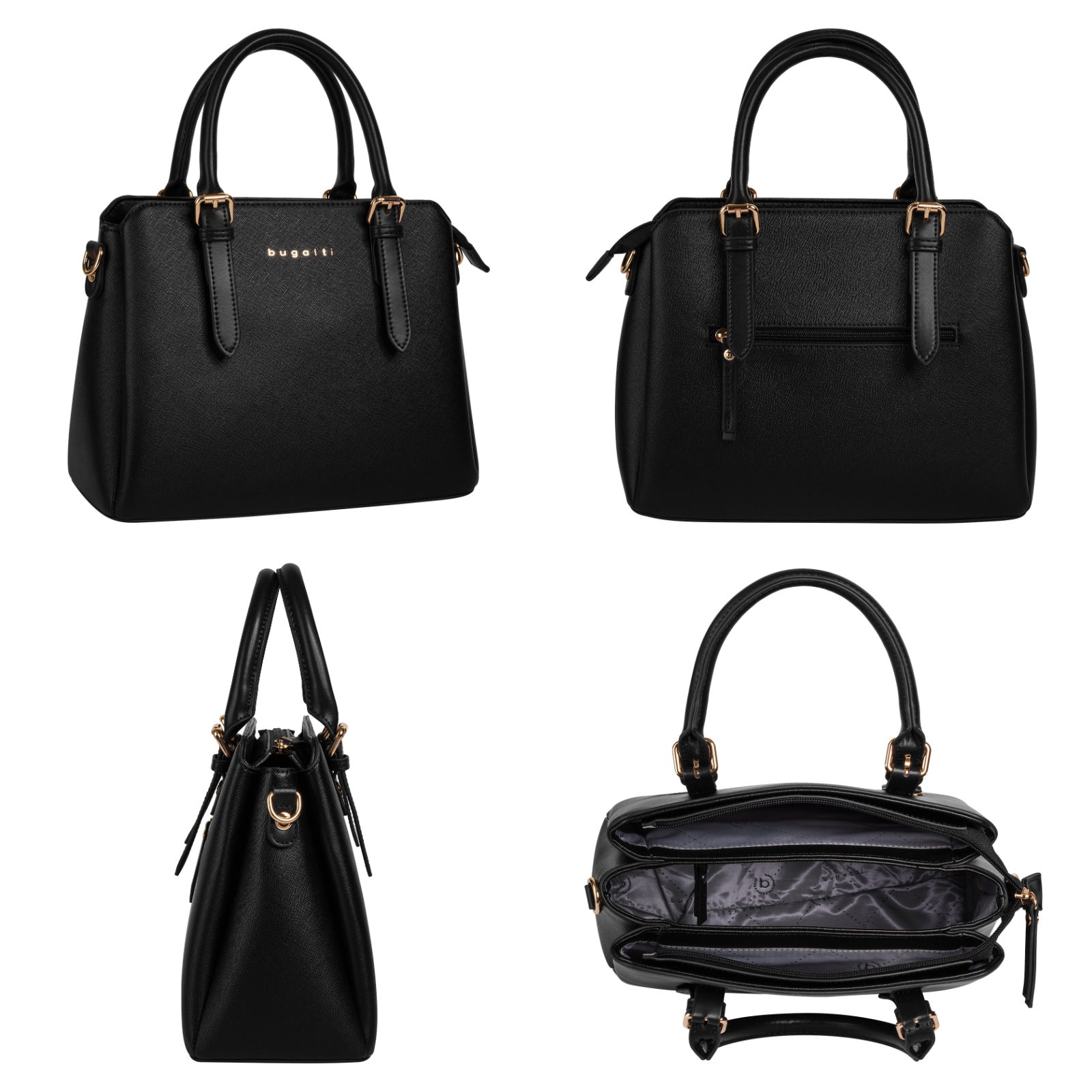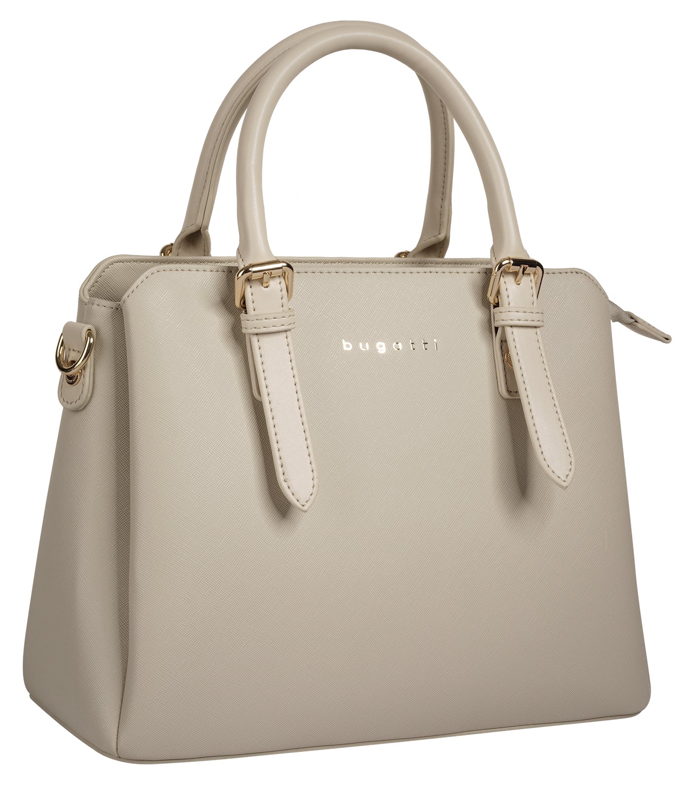 Alles, was das Herz begehrt: vereint in der Handtasche aus dem Hause bugatti! Mit ihrer strukturierten Oberfläche und den goldfarbenen Akzenten ist sie ein echter Blickfang. Mit ihr setzen Sie Ihren Outfits das Sahnehäubchen auf! Ebenso überzeugend gestaltet sich auch ihre Innenausstattung. So ist das Hauptfach mit jeweils einem Steck-, Reißverschluss- und einem Smartphonefach versehen. Zwei Nebenfächer sowie ein Rückfach stellen zusätzlichen Stauraum bereit. Um Ihnen unterwegs den maximalen Komfort zu bieten, verfügt die Tasche einerseits über Bodennieten. Diese schützen das Material vor frühzeitiger Abnutzung und sorgen für einen festen Stand. Andererseits lässt sich Ihr Trageerlebnis mithilfe des verstellbaren Schultergurts individualisieren.