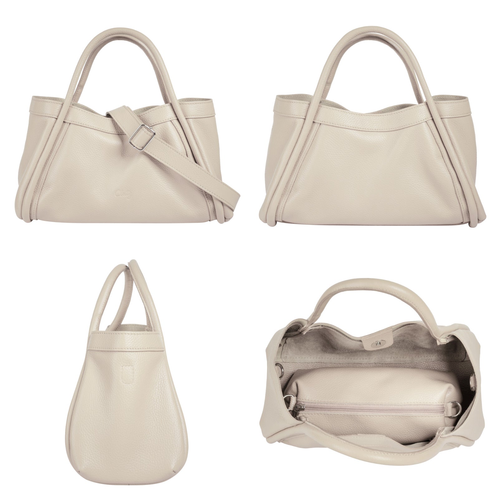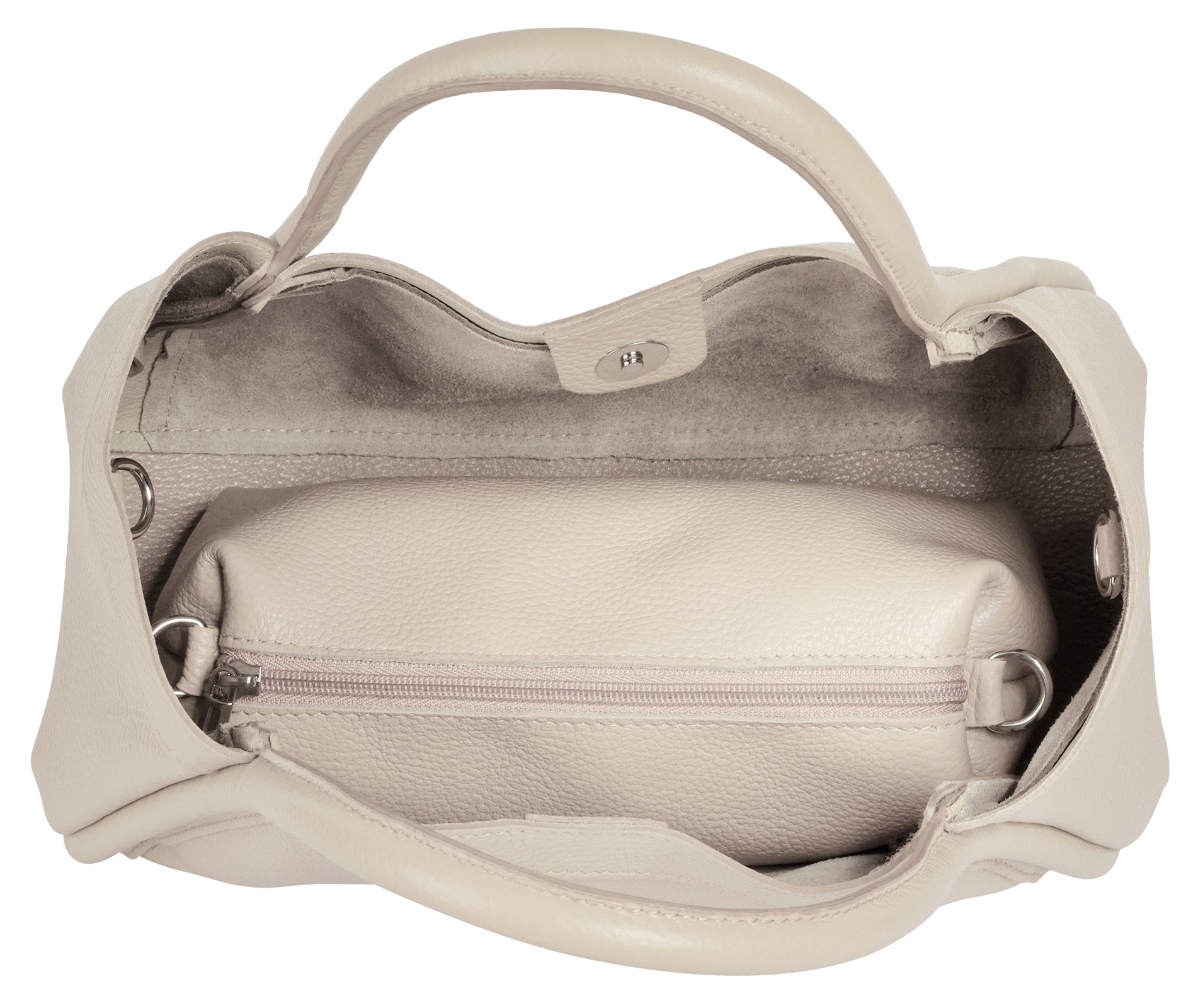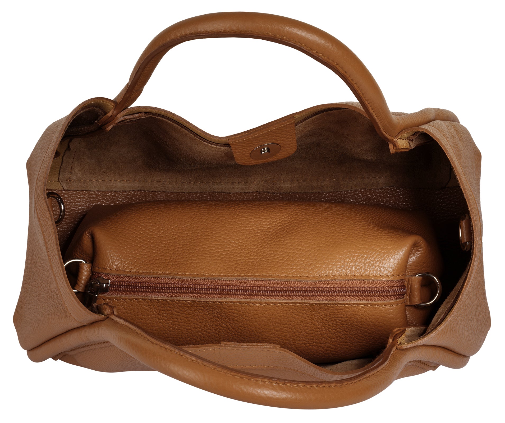 Mit der italienischen Leder Handtasche von Cluty erhalten Sie zwei Accessoires in einem! Die Kombination aus subtilem Design und hochwertigem Material machen sie zu einer Bereicherung für jede Garderobe und langlebigen Alltagsbegleiterin. Das Hauptfach bietet viel Platz für alles, was unterwegs nicht fehlen darf. Das Highlight: zu ihrer Ausstattung gehört eine herausnehm- und verschließbare Innentasche. Perfekt, um Ihren Tascheninhalt übersichtlich zu organisieren. Und besonders praktisch: beide Taschen können mithilfe des abnehmbaren Gurts auch bequem auf der Schulter getragen werden! Für zusätzliche Sicherheit lässt sich die Innentasche mithilfe des Karabiners außerdem am Hauptfach befestigen.
