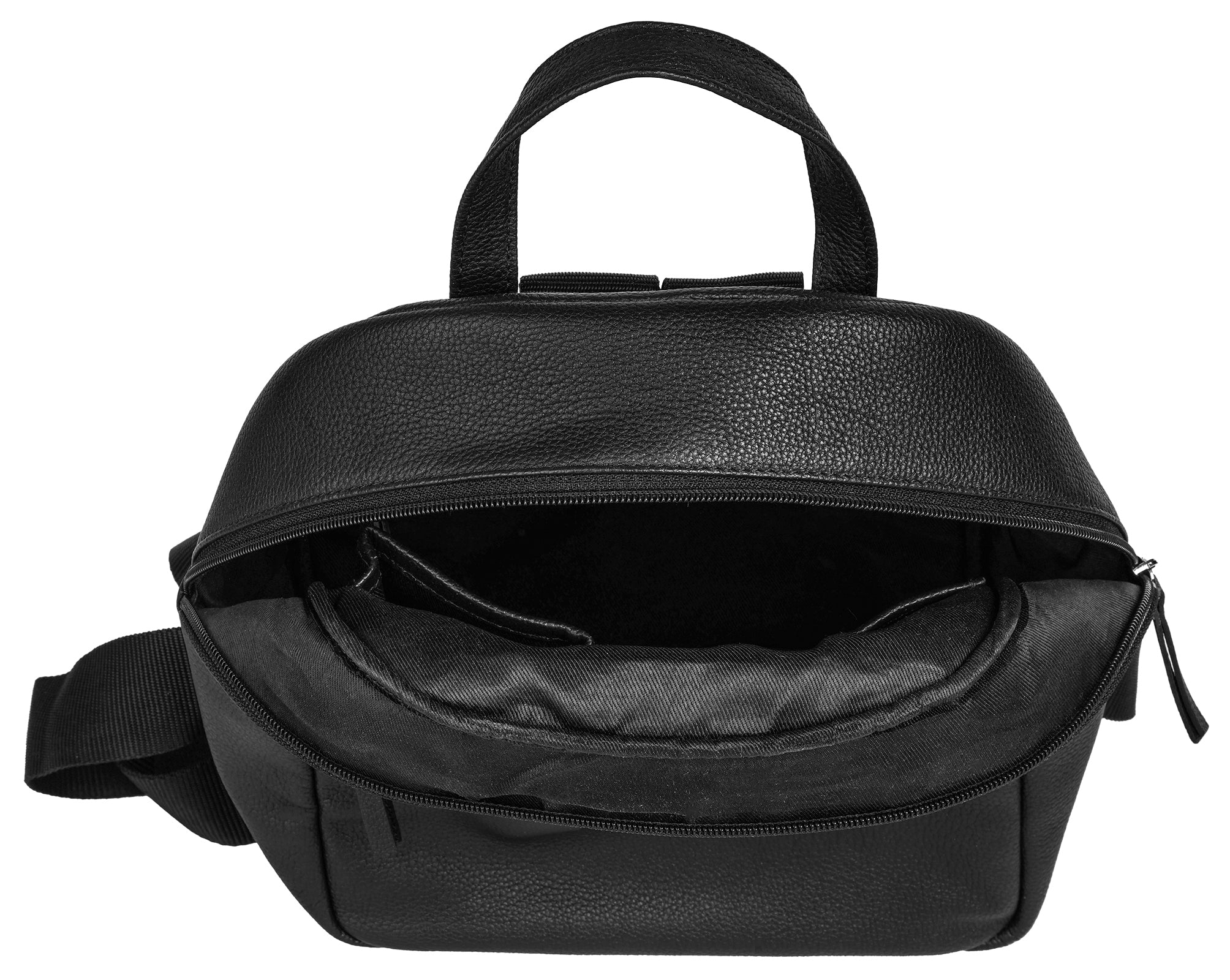 Das praktische Accessoire für Alltag, Freizeit und mehr: der Leder Rucksack von bruno banani! Mit seinem schlichten Design passt er sich optisch an jedes Outfit und jeden Anlass an. Im Hauptfach finden Sie verschiedene Einsteckmöglichkeiten für Essentials wie Smartphone, Schlüssel sowie Portemonnaie und auch eine kleine Wasserflasche, ein Taschenschirm, Terminplaner und mehr finden dort ihren Platz. Vorder- und Rückfach bieten noch mehr Stauraum. Die breiten Träger liegen angenehm auf der Schulter und lassen sich stufenlos verstellen. So genießen Sie mit dem City-Rucksack absolute Bewegungsfreiheit und maximalen Tragekomfort.