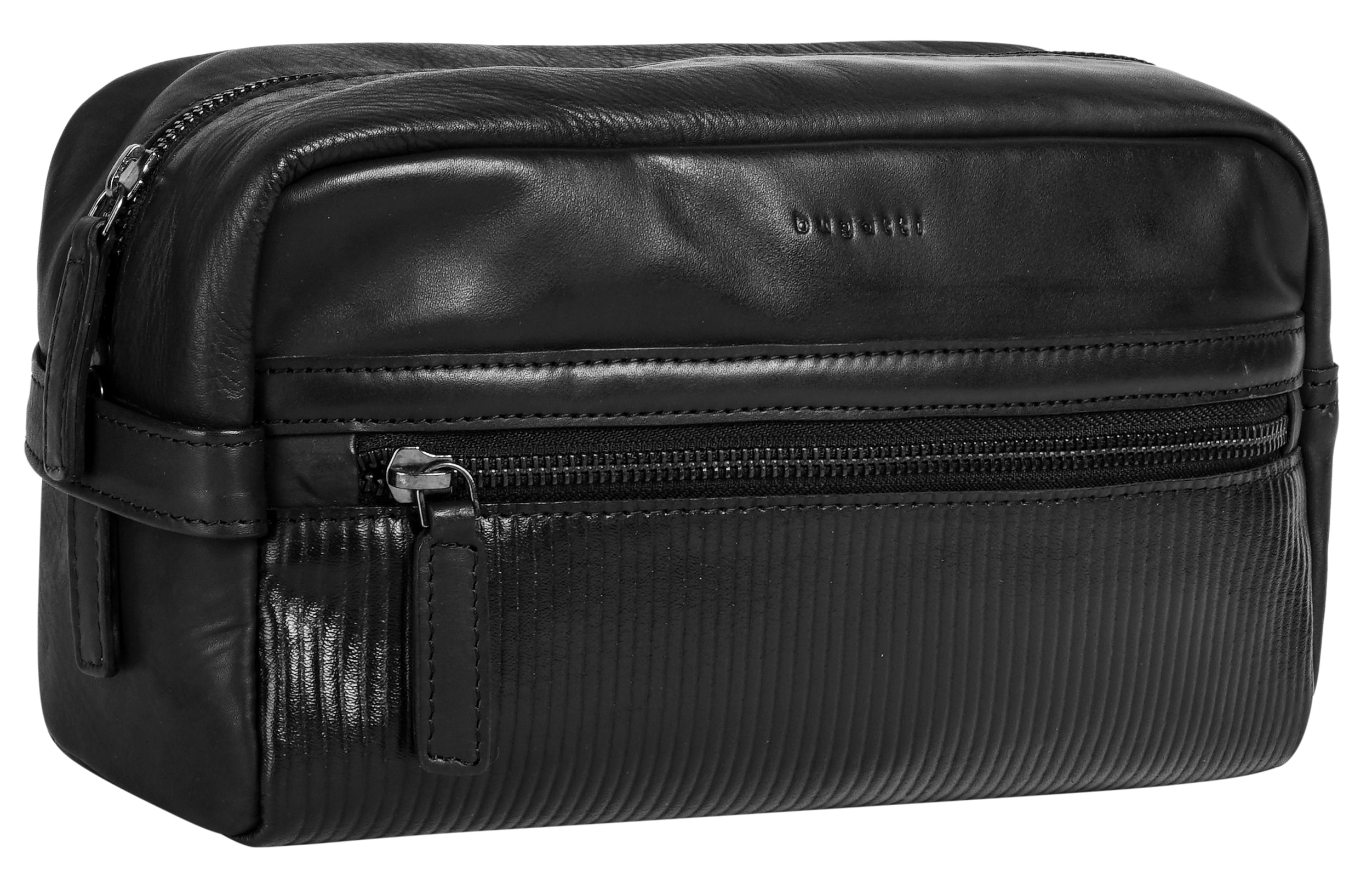 Die Leder Kulturtasche von bugatti vereint hochwertiges Design und Funktionalität. So ergibt das Zusammenspiel von glattem Material und Plissee-Struktur, ergänzt durch metallene Hardware, eine exklusive Optik. Das Hauptfach trägt alles, was unterwegs nicht fehlen darf. Von der Shampooflasche bis zur Haarspraydose: dank seines Längsformats finden sie ohne Weiteres Platz in Ihrem Necessaire. Darüber hinaus enthält es vier Steckfächer für Toilettenartikel und Kleinteiliges. Zwei verschließbare Außentaschen bieten zusätzlichen Stauraum. Zu guter Letzt wird die Ausstattung von einem seitlichen Henkel vervollständigt.