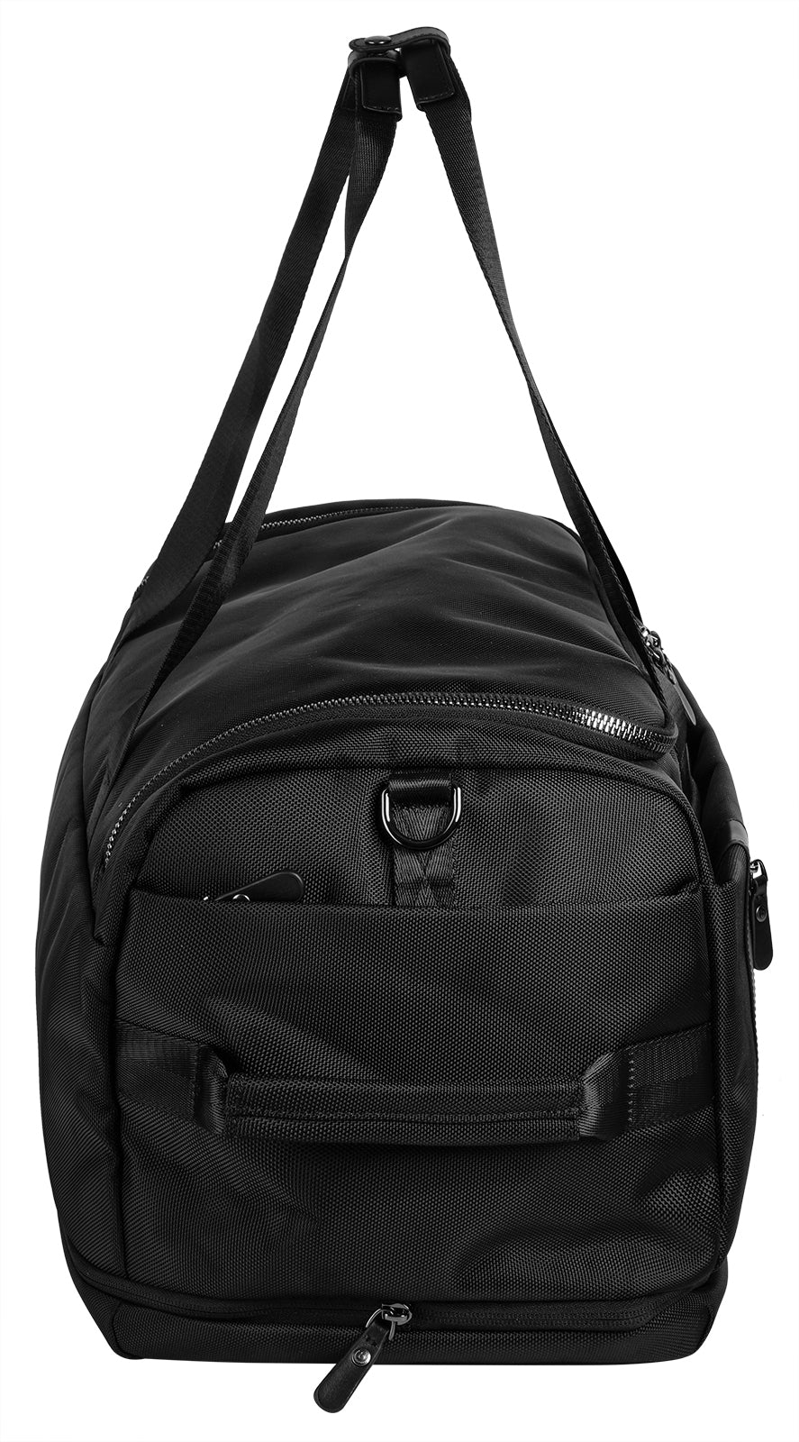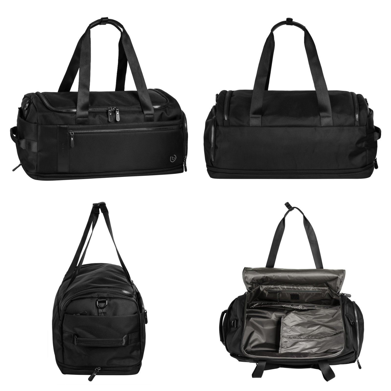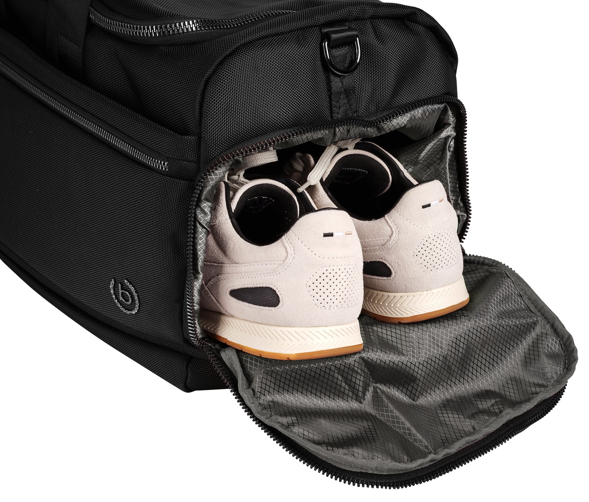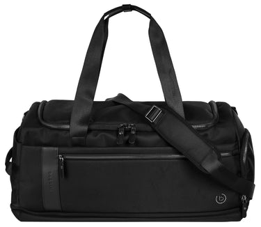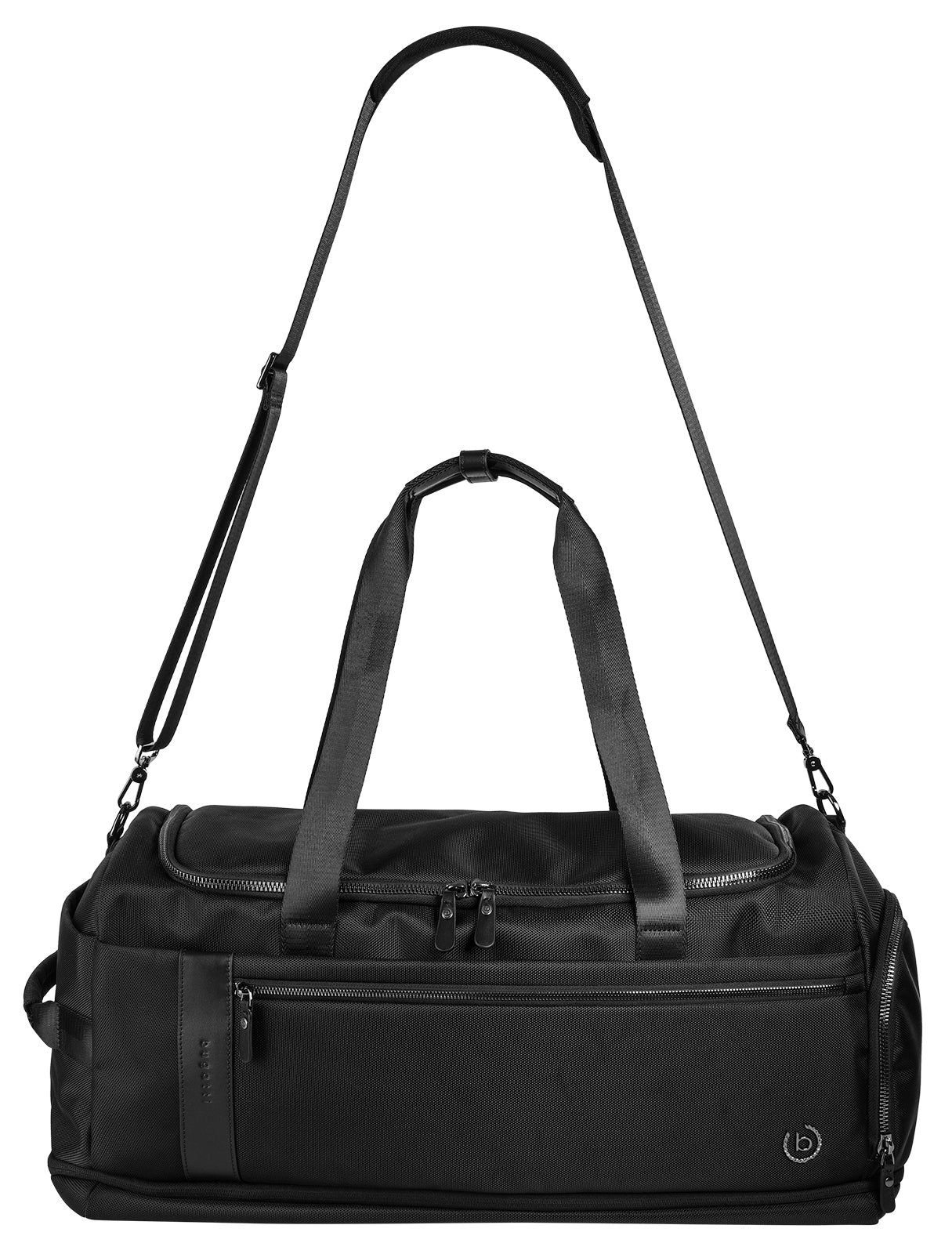 Verreisen mit Stil und Komfort: mit der Reisetasche von bugatti. Die Kombination aus strukturiertem Stoff, dezenten Lederelementen und glänzenden Metalldetails verleiht ihr ein modernes Aussehen. Zu ihrem Fächerrepertoire gehören ein Reißverschluss- und zwei Steckfächer, Stiftschlaufen sowie mehrere Reißverschlussfächer an den Außenseiten. Für zusätzlichen Stauraum lässt sich das Hauptfach erweitern. Weiterhin ist der Weekender mit einem verschließbaren Schuhfach ausgestattet. So bewahren Sie Ihr Schuhwerk separat vom restlichen Tascheninhalt auf und müssen sich keine Gedanken über verschmutzte Kleidung machen! Zwischen abnehmbarem Schultergurt, langen Henkeln und einem Seitengriff ergeben sich zahlreiche Tragevariationen für maximalen Komfort!