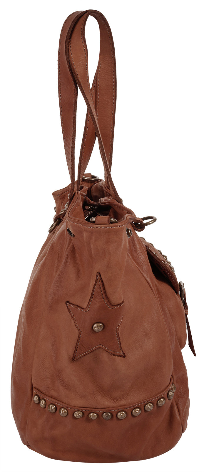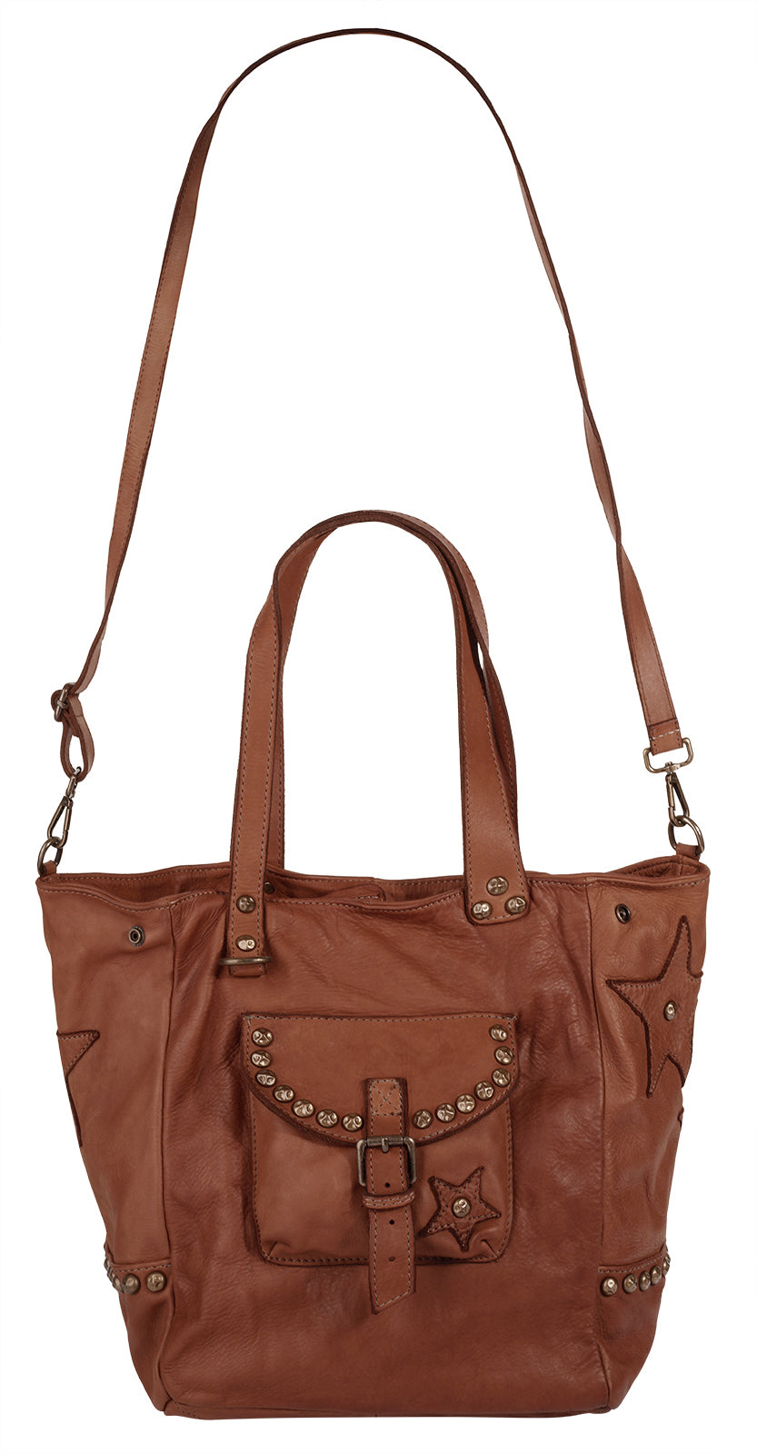 Der Damen echt Leder Shopper von Samantha Look mit coolem Nieten- und Sternenbesatz ist ein unverzichtbarer Begleiter mit Pfiff. Ein abnehmbarer und längenverstellbarer Schultergurt, die angenehm weichen Henkel, das geräumige Hauptfach mit diversen Verstaumöglichkeiten sowie seitlich angebrachte Magnetknöpfe zur Vergrößerung der Tasche lassen ihre Unterlagen, Einkäufe und Dinge des Alltags bequem transportieren und sicher sowie geordnet verstauen.