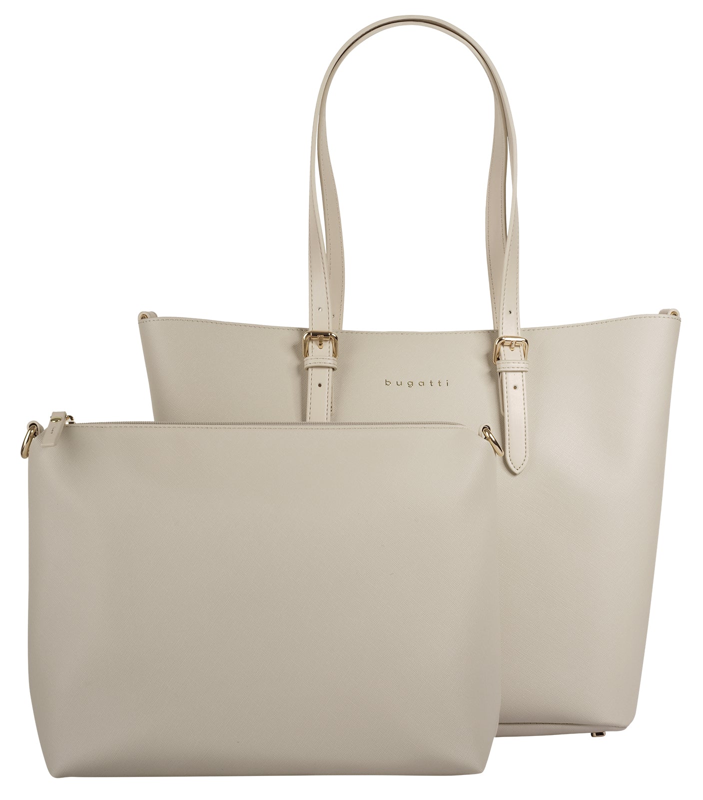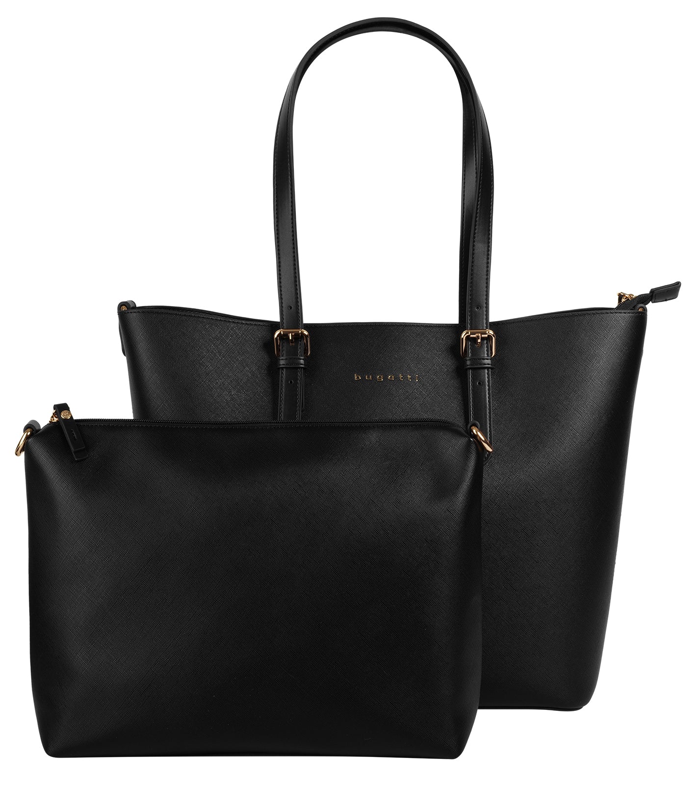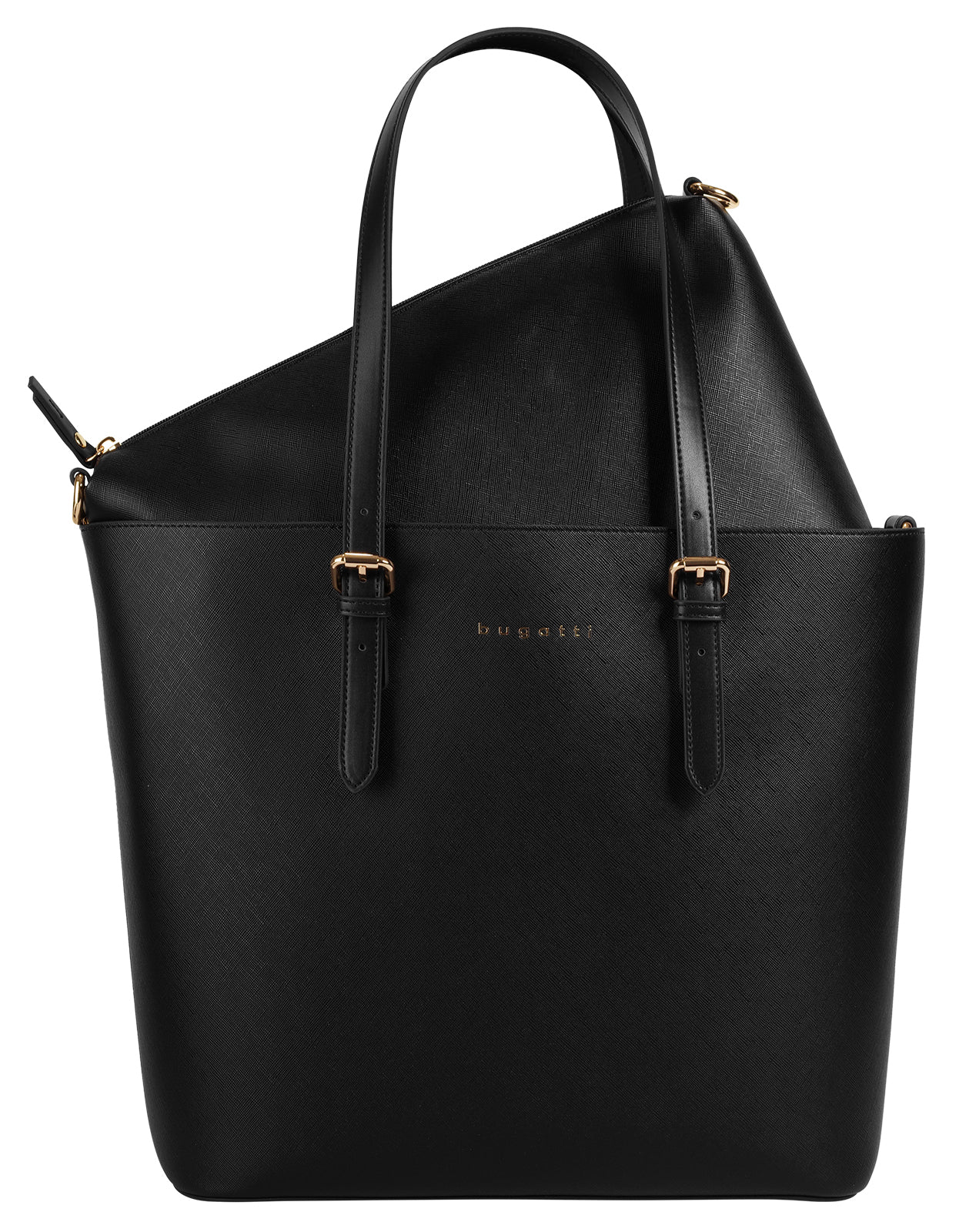 Mit dem Shopper von bugatti gehören Platzprobleme endgültig der Vergangenheit an! Sein geräumiges Hauptfach trägt alles, von alltäglichen Essentials bis hin zur Ausbeute spontaner Shoppingtouren. Mithilfe der verschließ- und herausnehmbaren Innentasche lässt sich Ihr Tascheninhalt noch besser organisieren. Und das Beste: ausgestattet mit jeweils einem Steck- und Reißverschlussfach sowie passenden Ringen für den Schultergurt, kann die Innentasche sogar eigenständig getragen werden! Um Ihnen maximalen Komfort zu bieten, verfügt der Shopper außerdem über Bodennägel, längenverstellbare Henkel sowie einen verstell- und abnehmbaren Schultergurt.