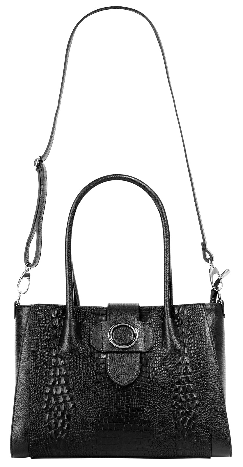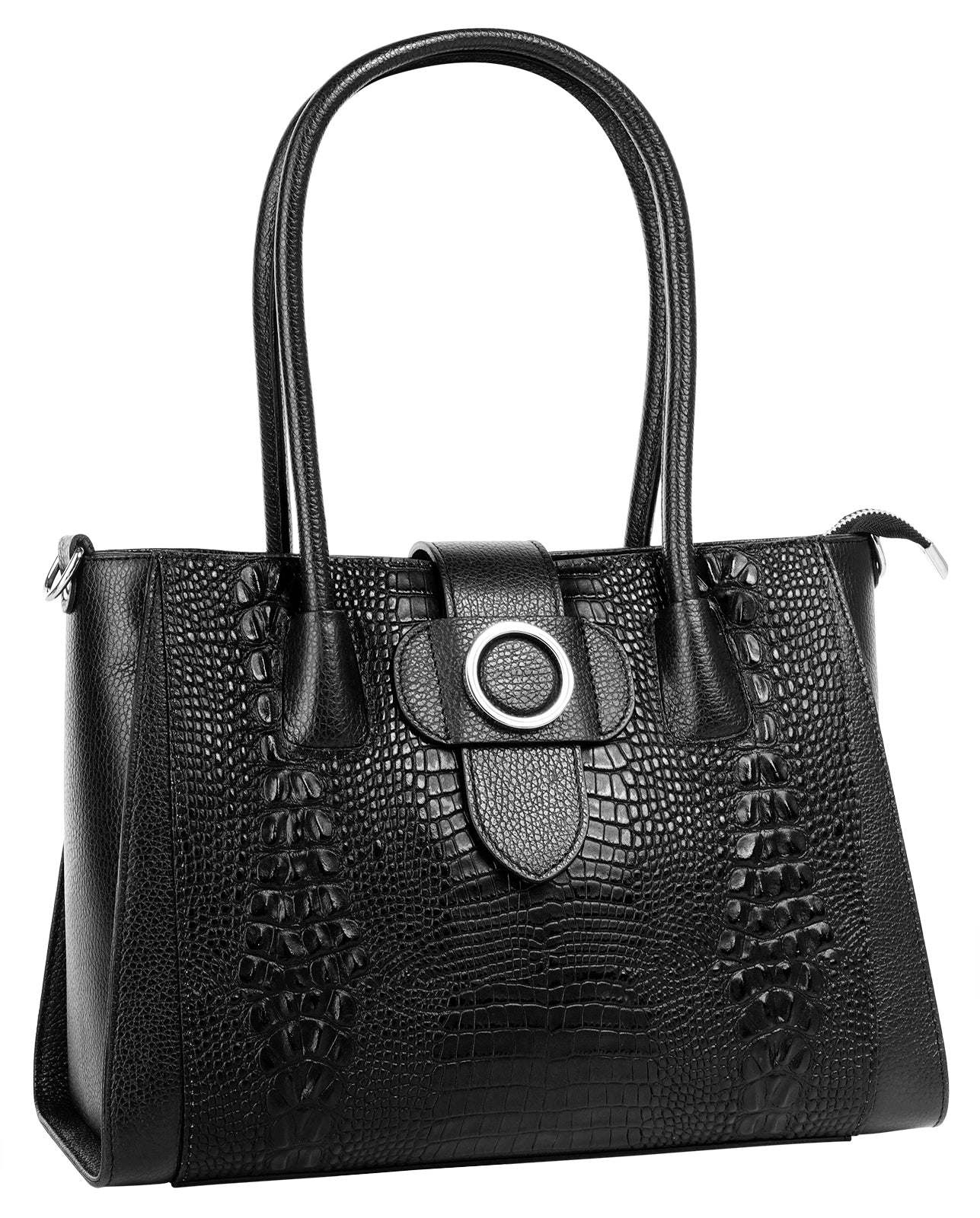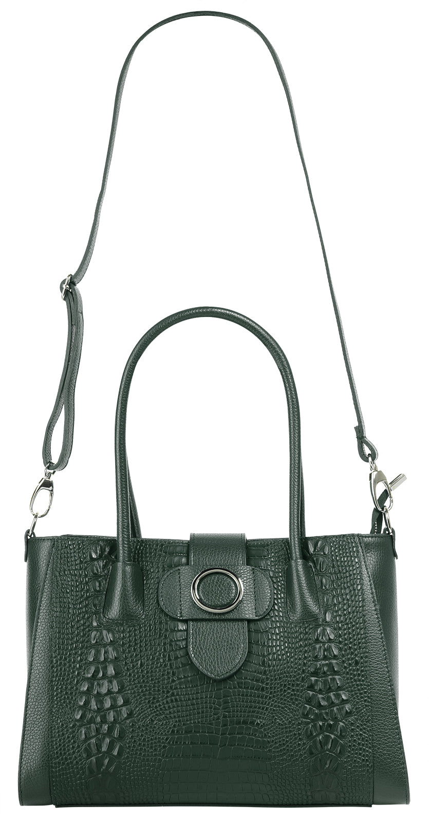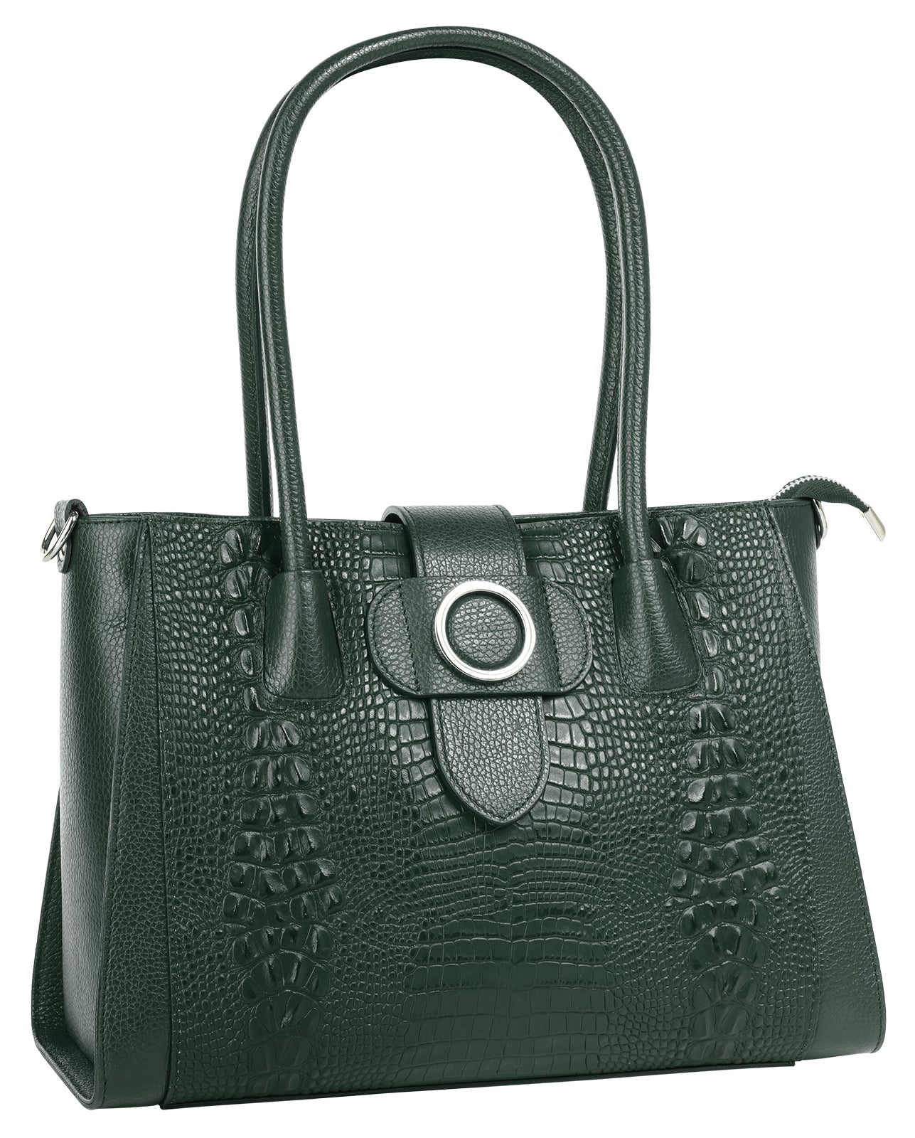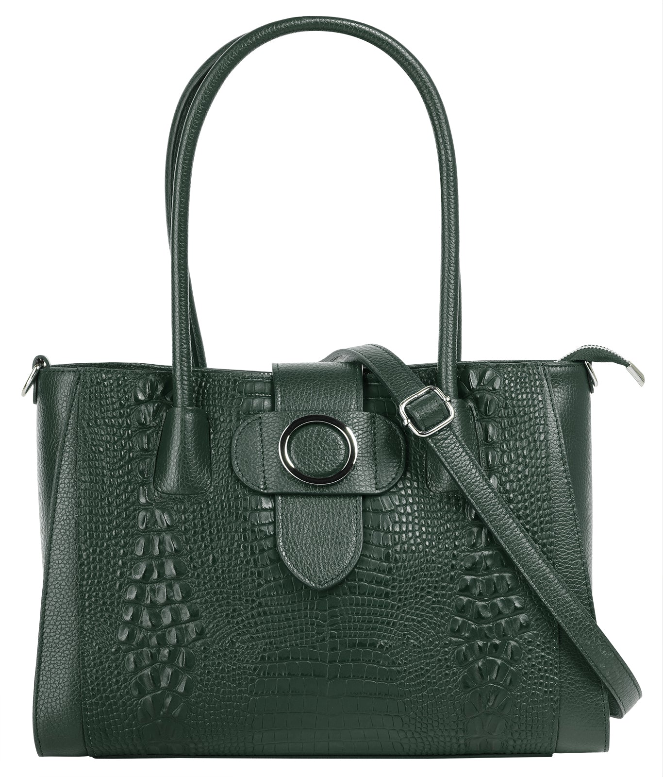 Dieser Damen Leder Shopper in Kroko Optik von Cluty ist geradezu bestimmt für Sie! Die aufwendige Narbenprägung in Kroko Optik setzt in jedem Ihrer legeren Outfits ein Highlight. Dank einer mittigen Reißverschlusstasche ist das Hauptfach 2-geteilt. Das ermöglicht Ihnen mehr Spielraum in der ordentlichen Verwahrung von Portemonnaie, Wasserflasche und Taschentücher. Besonders raffiniert: Eine Steckschlaufe mit silbernem Detail verschließt Ihren Leder Shopper zusätzlich & sieht schick aus. Je nach Anlass können Sie zwischen 2 Tragevarianten wählen: als Handtasche oder als Umhängetasche. Somit ist Ihre Leder Tasche ideal geeignet für Shopping-Erlebnisse und für den täglichen Gebrauch. Bodennägel schützen Ihren Kroko Shopper vor Abnutzung.