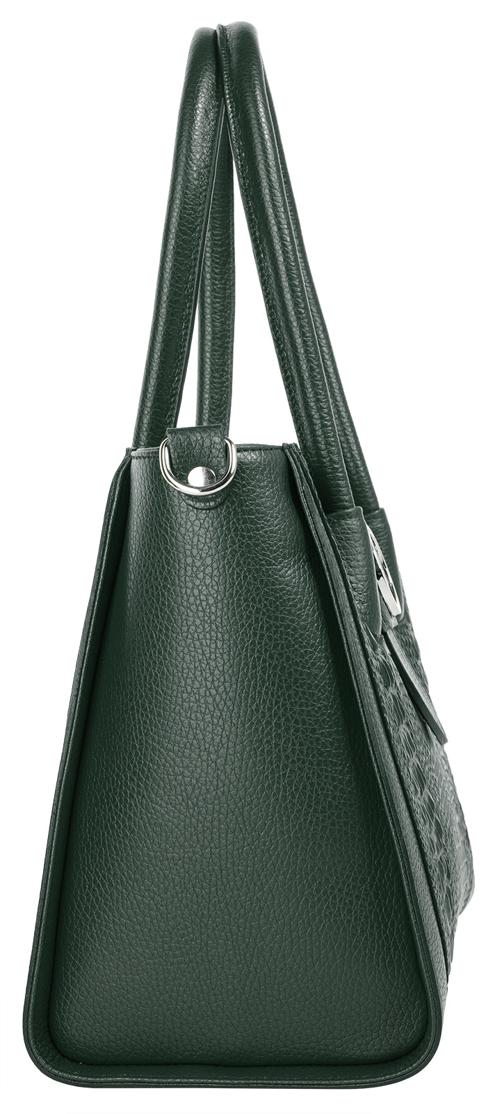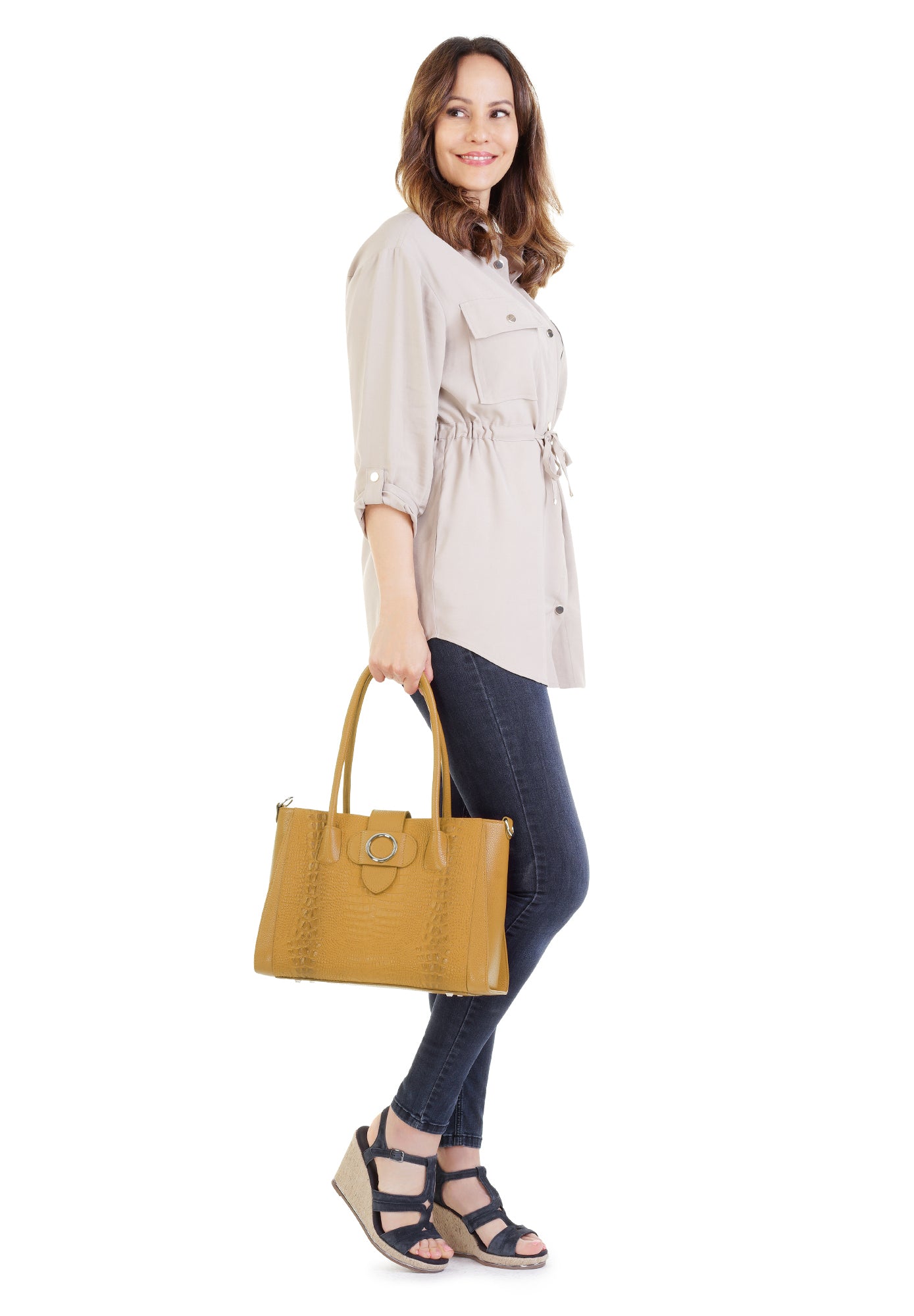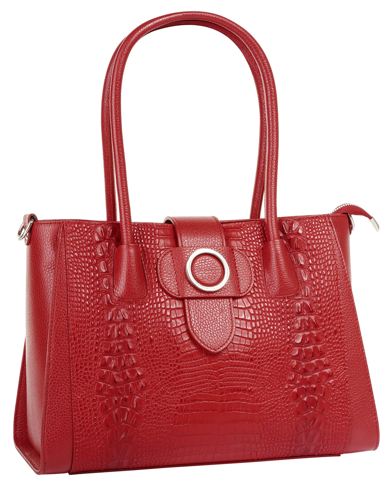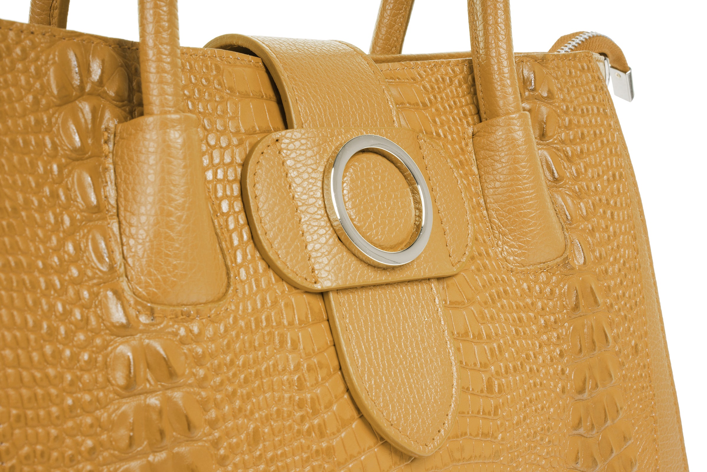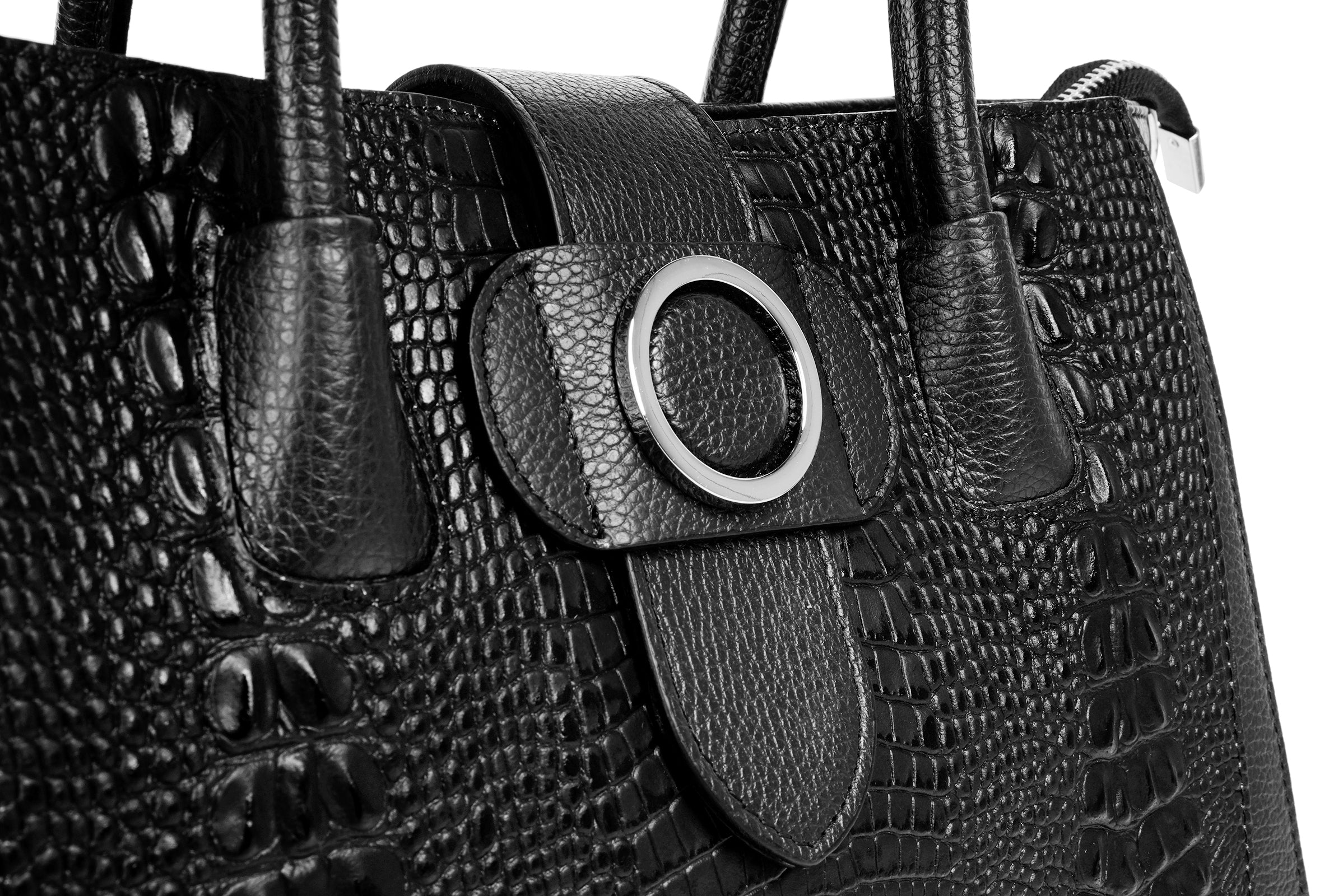 Dieser Damen Leder Shopper in Kroko Optik von Cluty ist geradezu bestimmt für Sie! Die aufwendige Narbenprägung in Kroko Optik setzt in jedem Ihrer legeren Outfits ein Highlight. Dank einer mittigen Reißverschlusstasche ist das Hauptfach 2-geteilt. Das ermöglicht Ihnen mehr Spielraum in der ordentlichen Verwahrung von Portemonnaie, Wasserflasche und Taschentücher. Besonders raffiniert: Eine Steckschlaufe mit silbernem Detail verschließt Ihren Leder Shopper zusätzlich & sieht schick aus. Je nach Anlass können Sie zwischen 2 Tragevarianten wählen: als Handtasche oder als Umhängetasche. Somit ist Ihre Leder Tasche ideal geeignet für Shopping-Erlebnisse und für den täglichen Gebrauch. Bodennägel schützen Ihren Kroko Shopper vor Abnutzung.