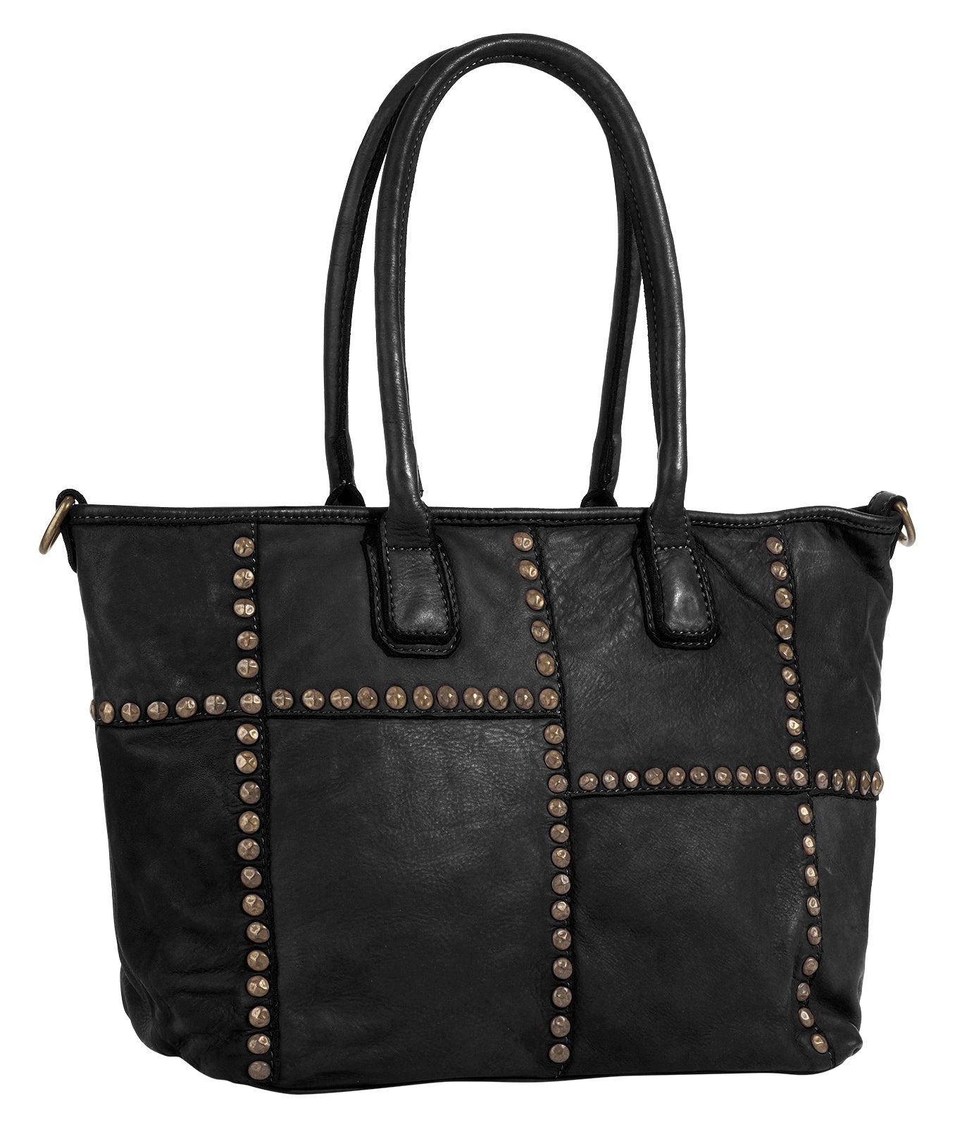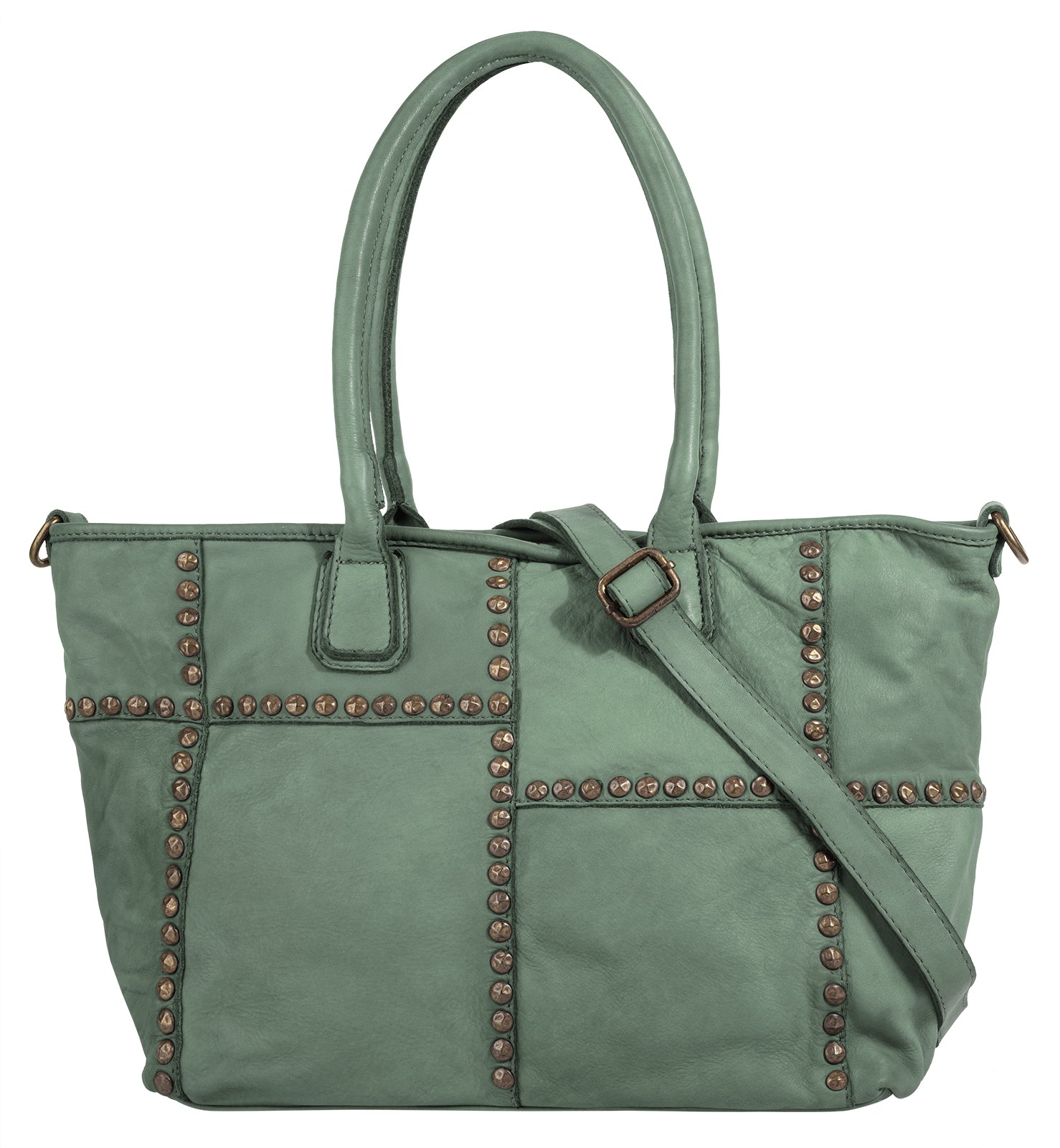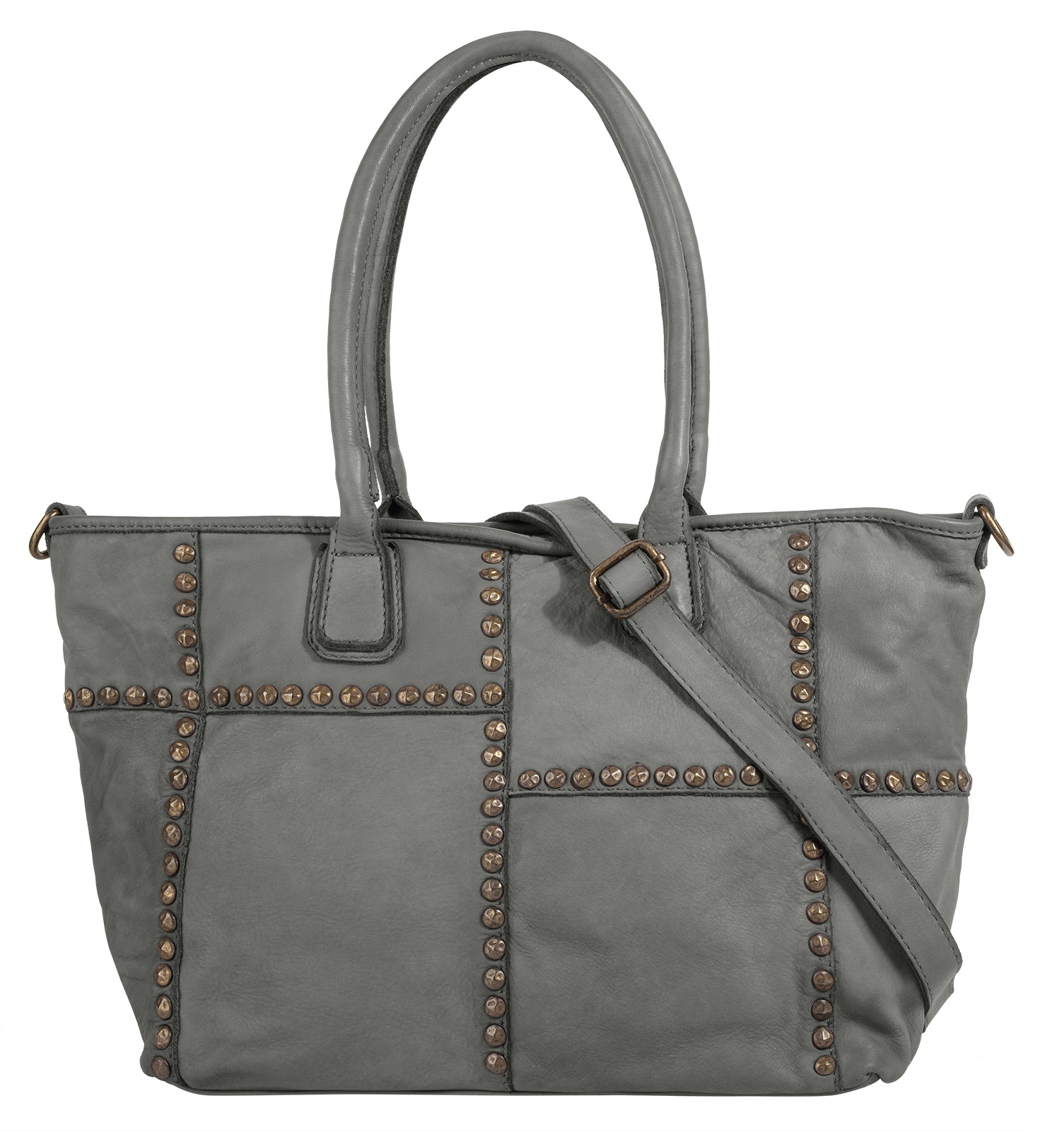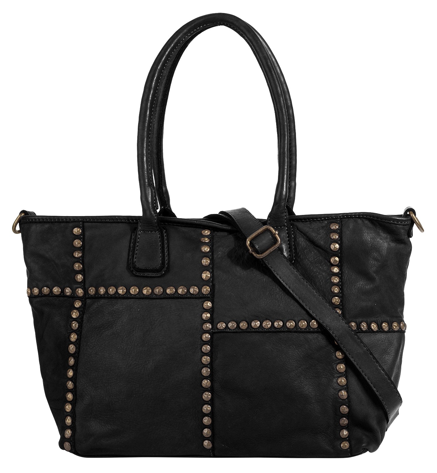 Der italienische Leder Shopper von Samantha Look ist ein echter Blickfang! Metallapplikationen säumen die Nähte des Patchwork Musters und verleihen der Tasche somit einen trendigen Look. Ausgedehnten Shoppingtouren steht mit dem geräumigen Hauptfach nichts im Weg. Für mehr Variation und Komfort beim Tragen sorgt ein abnehmbarer Schultergurt.