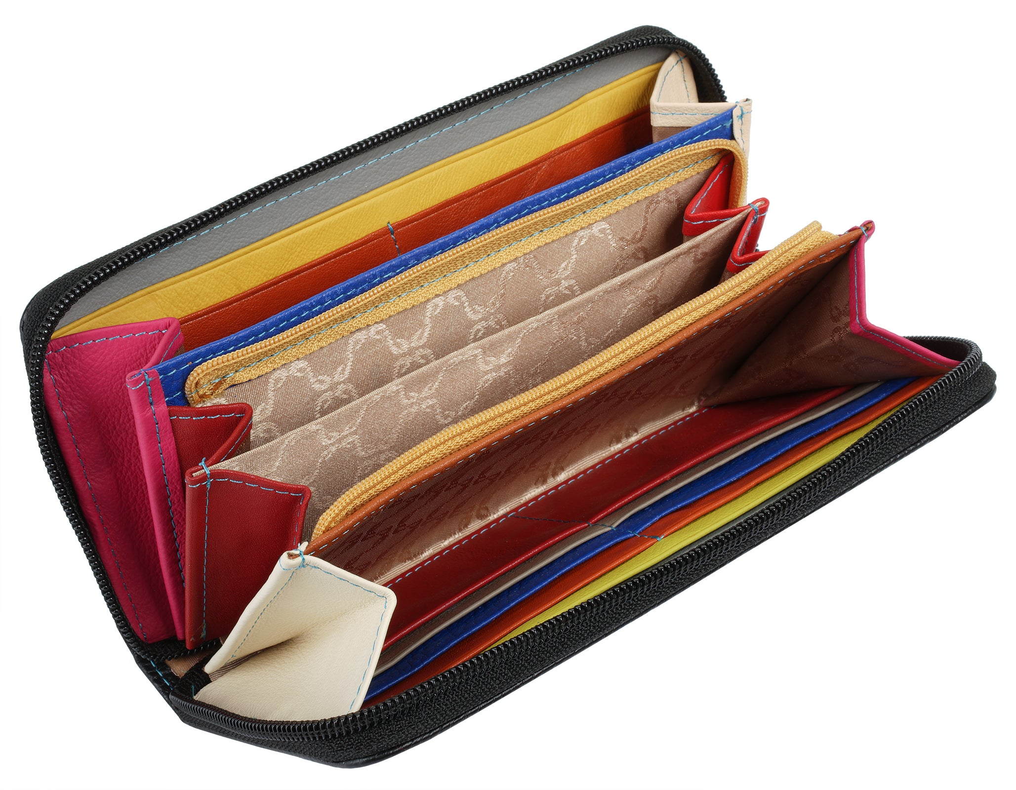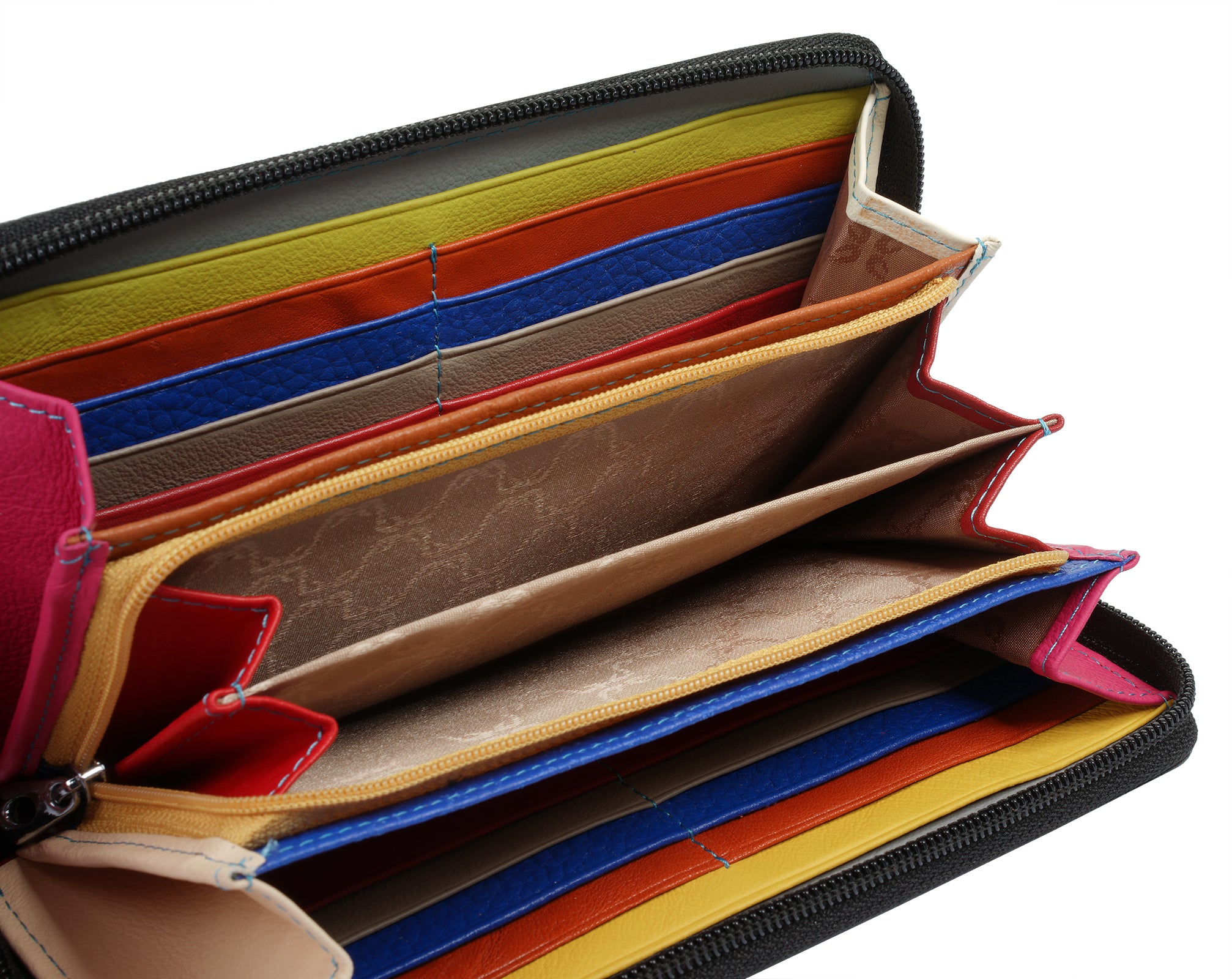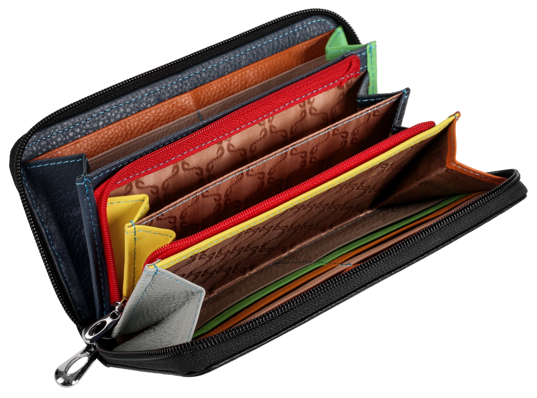 Ihr buntes Inneres präsentiert Ihre Leder Damen Geldbörse von Bagan nur Ihnen. Außen glänzt sie mit einem dezenten und klassischen Look. Das schwarze Leder ist sehr schön gemasert und angenehm geschmeidig. Im Inneren strahlt Ihre Leder Damen Geldbörse von Bagan in fröhlich-bunten Farbtönen. Ein Konzept, das begeistert!