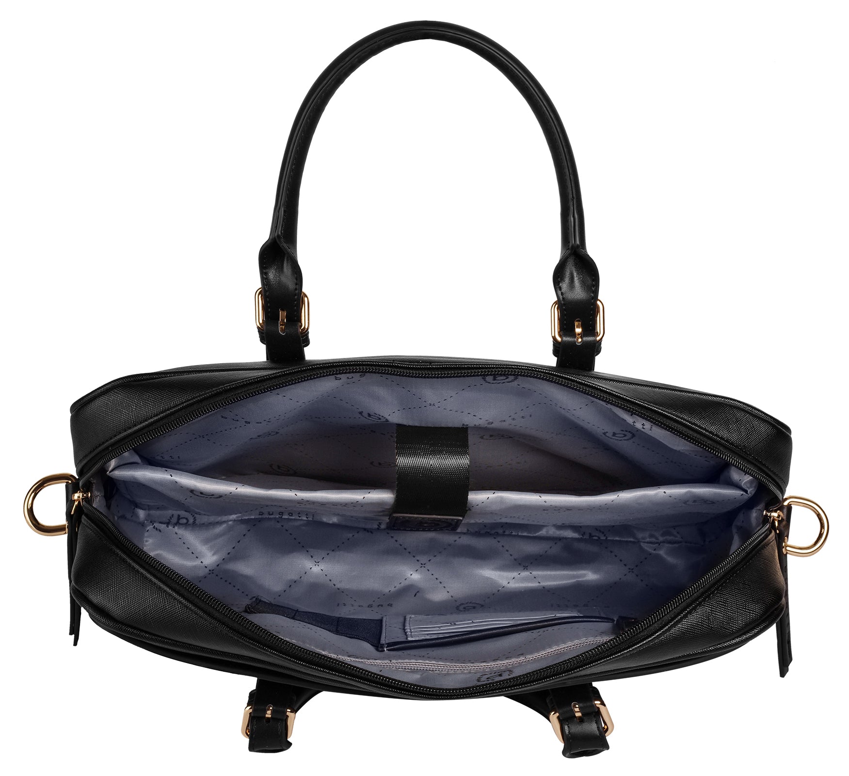 Mit der Businesstasche von bugatti sind Sie bestens für den Arbeitsalltag gewappnet! Das stabile Material hält den Belastungen der regelmäßigen Benutzung stand und verleiht der Tasche mit seiner strukturierten Oberfläche einen Look mit Wiedererkennungswert. Das Hauptfach enthält ein gepolstertes Notebookfach, Kartenfächer, Stiftschlaufen sowie jeweils ein Steck- und Reißverschlussfach. Diese Ausstattung unterstützt Sie dabei, Arbeitsmaterial, persönliche Gegenstände und Elektronik übersichtlich zu verstauen. Außenfächer stellen zusätzlichen Stauraum bereit. Im Rückfach finden Sie außerdem eine Trolleyhalterung. Für maximalen Komfort unterwegs können Sie zwischen festen Henkeln und einem abnehmbaren Schultergurt wechseln.