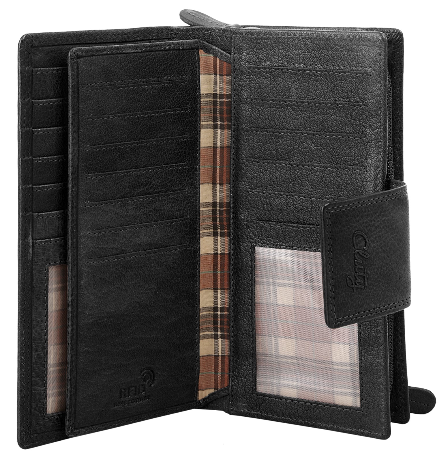 Die Leder Geldbörse von Cluty lässt kaum Wünsche offen: übersichtlich, umfangreich und elegant. Insgesamt 25 Steckfächer bieten viel Platz für Karten, kleinen Notizen und Fotos. Insbesondere Bankkarten sind in dieser Leder Geldbörse sicher aufbewahrt. Dafür sorgt der integrierte RFID-Schutz, der Ihre Daten vor Missbrauch und Zugriff durch Scans schützt!