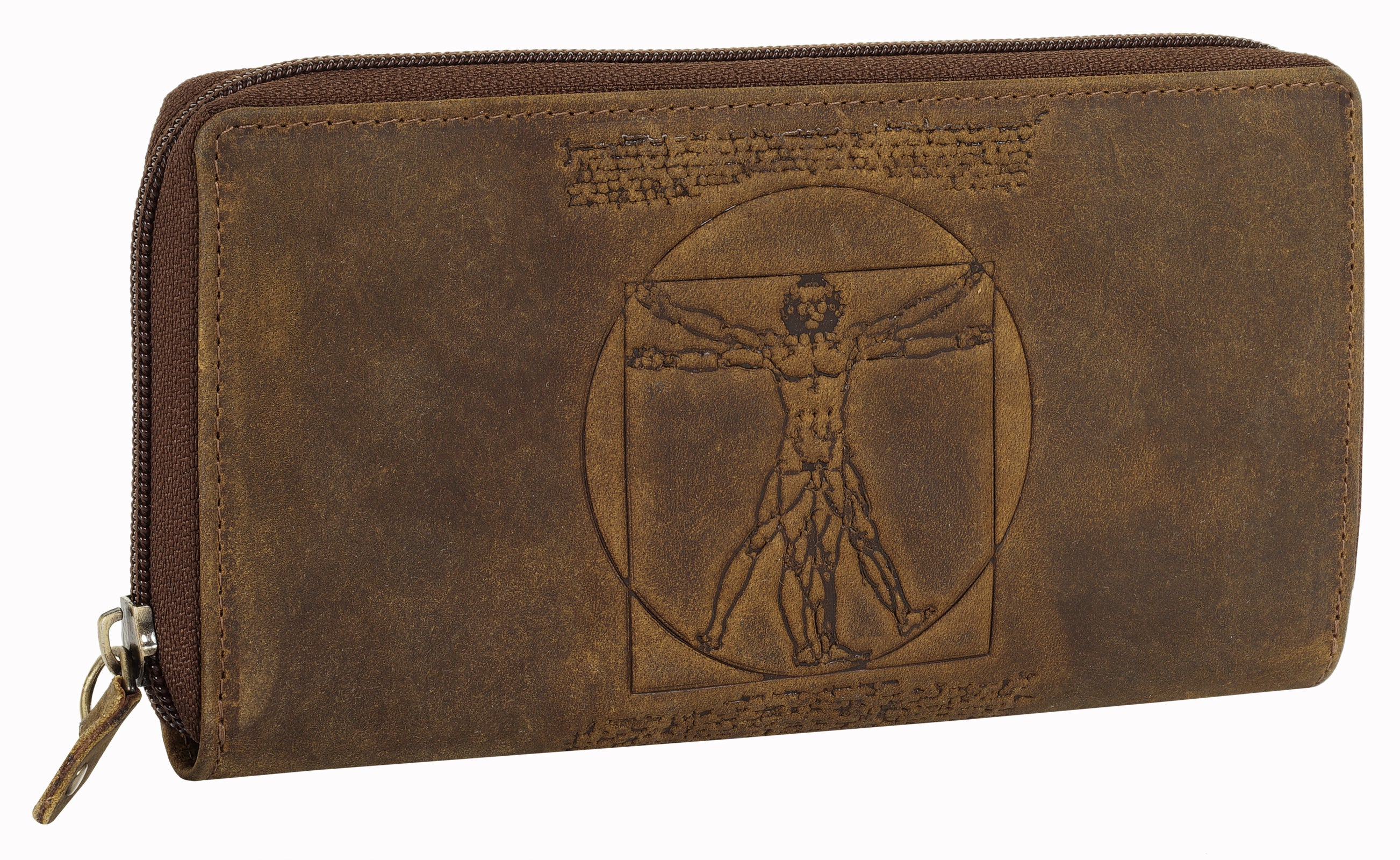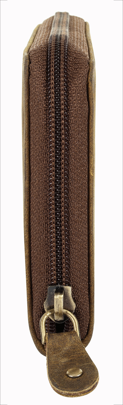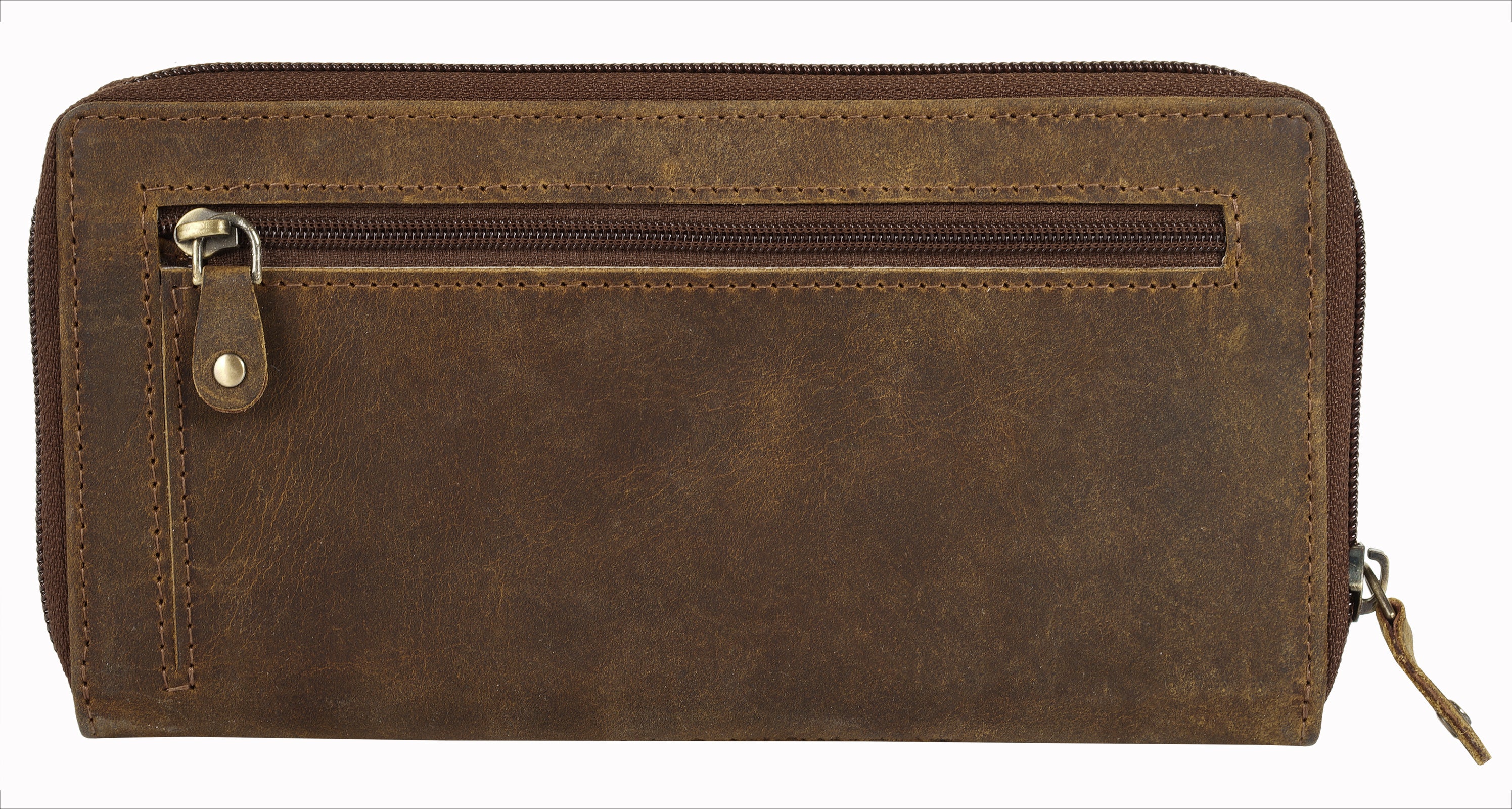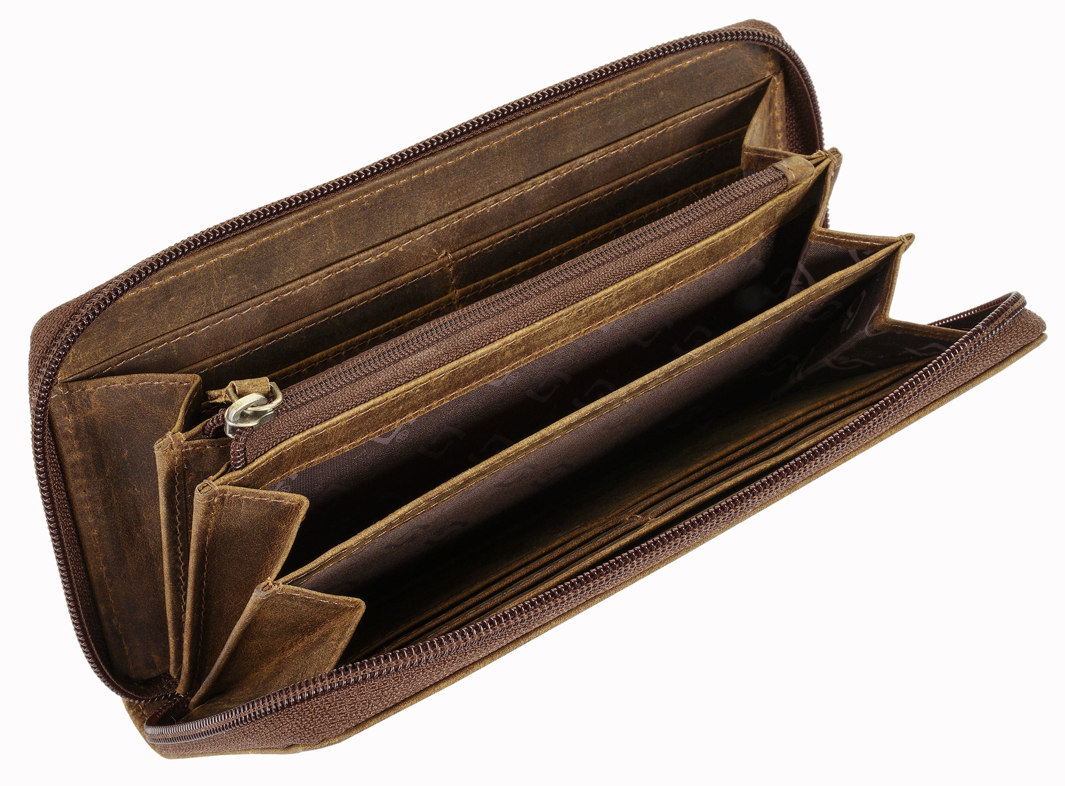 Die Damen Leder Geldbörse im Vintage Look von Landleder wird Sie überzeugen! Ihr Querformat Portemonnaie ist übersichtlich, umfangreich und angesagt. 14 Steckfächer bieten viel Platz für Bank- und Visitenkarten. Der umlaufende Reißverschluss sorgt für Übersicht & hält den wertvollen Inhalt kompakt zusammen. Das separat außen liegende Reißverschlussfach ist schnell zugänglich & sicher verschlossen. Eine Motiv-Prägung im Vintage Look rundet dieses trendige Portemonnaie ab.