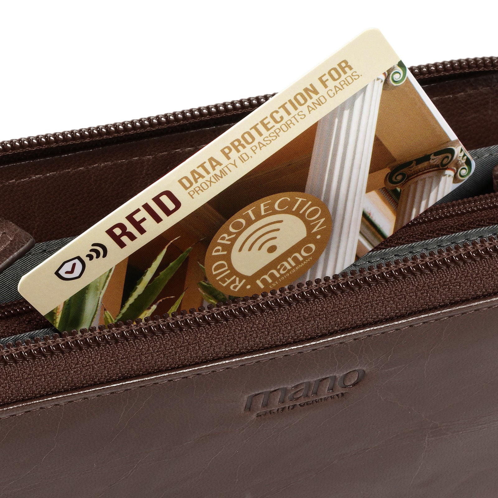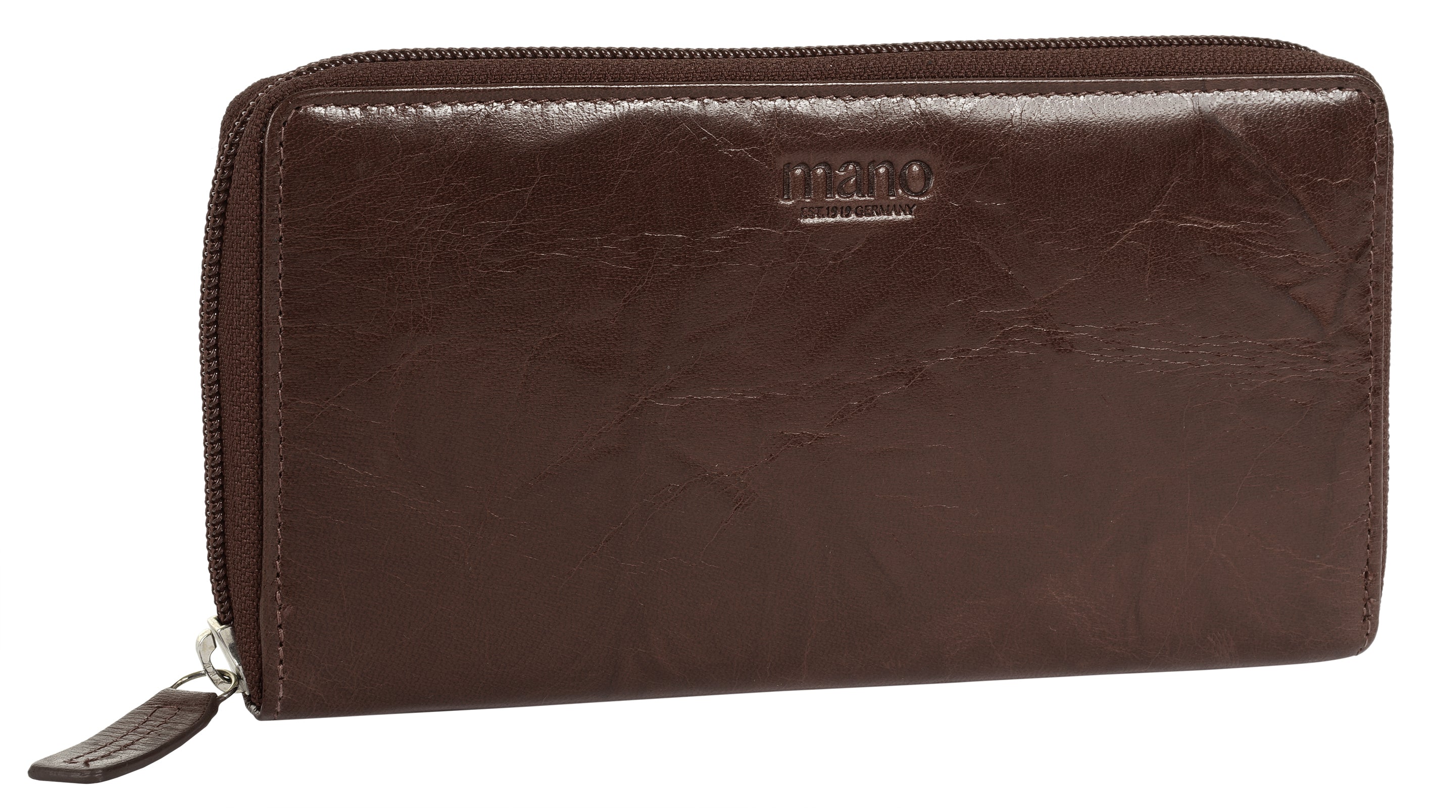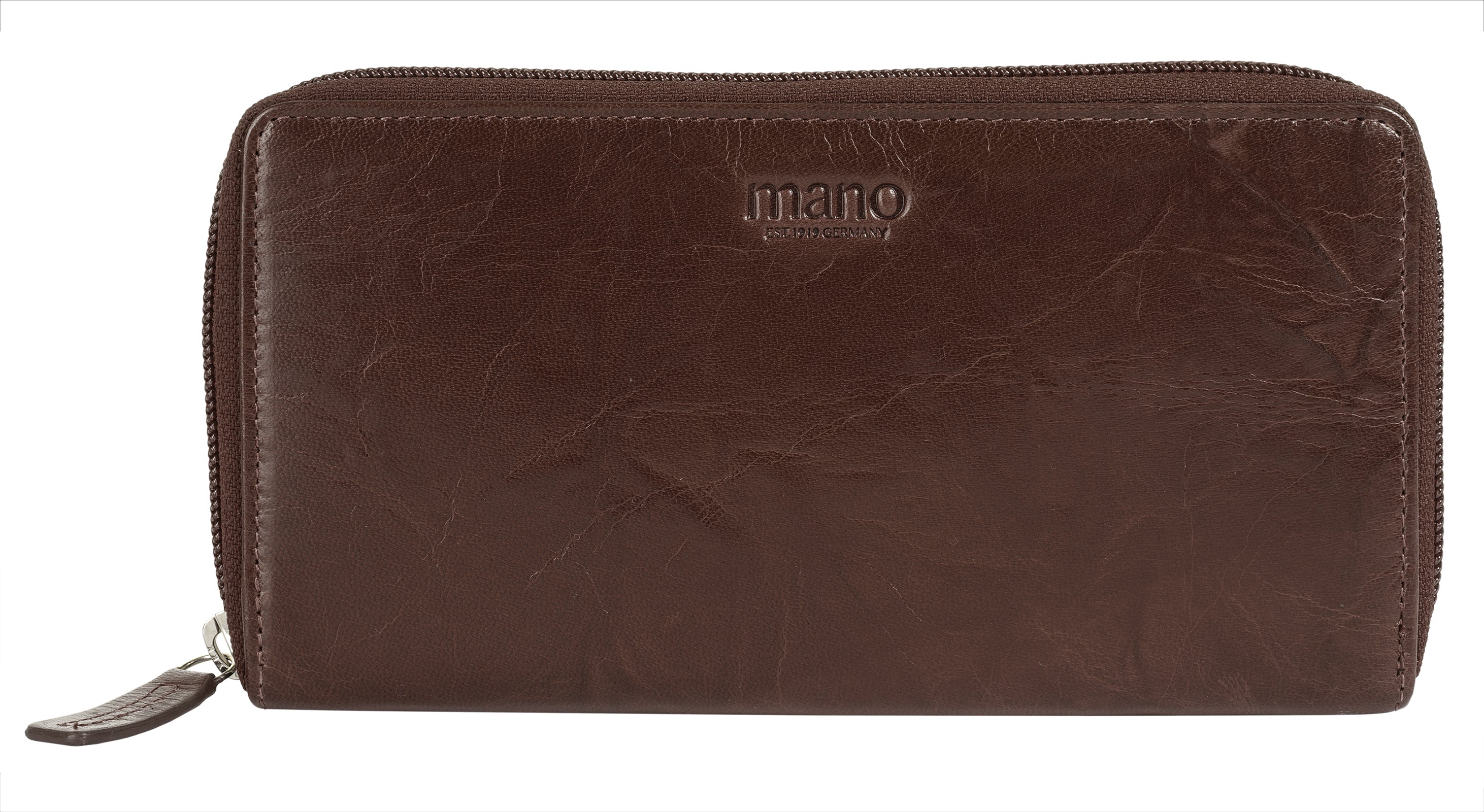 Die Damen Leder Geldbörse im Querformat aus dem Hause mano zeugt von Eleganz & Klasse. Übersichtlich & funktional werden all Ihre Karten und Bargeldoptionen aufbewahrt. 2 Schein-, 8 Karten- & 3 Steckfächer sowie 1 Münzfach mit Reißverschluss ermöglichen dies. 4 Kartenfächer bieten maximale Sicherheit: Der integrierte RFID-Schutz verhindert Datenmissbrauch via NFC-Scan. Ein umlaufender Reißverschluss hält Ihr zeitloses Portemonnaie sicher zusammen. Die natürliche Strukturierung des verarbeiteten Oberleder ist individuell und kann daher von der Abbildung abweichen.