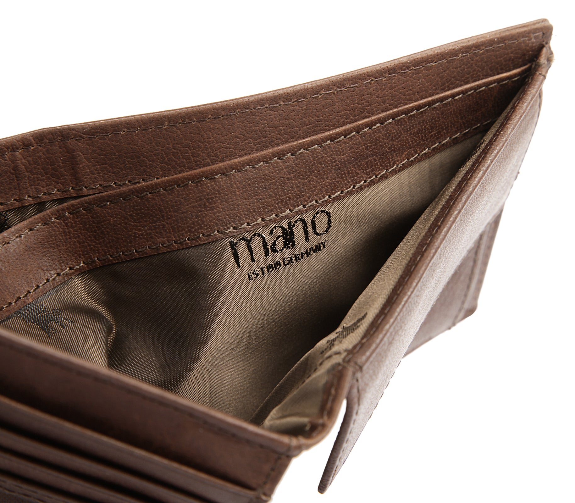 Stilvolle Männer Leder Geldbörse im legeren Look der Marke MANO. Für Übersicht in Ihrem Portemonnaie sorgt das schlichte Design: 2-fach klappbar & SlimFold. 10 Steck- und Kartenfächer ermöglichen eine geschützte Verwahrung Ihrer Wertsachen. Dank des schmalen Designs passt sie wunderbar in Jacken-oder Hosentasche.